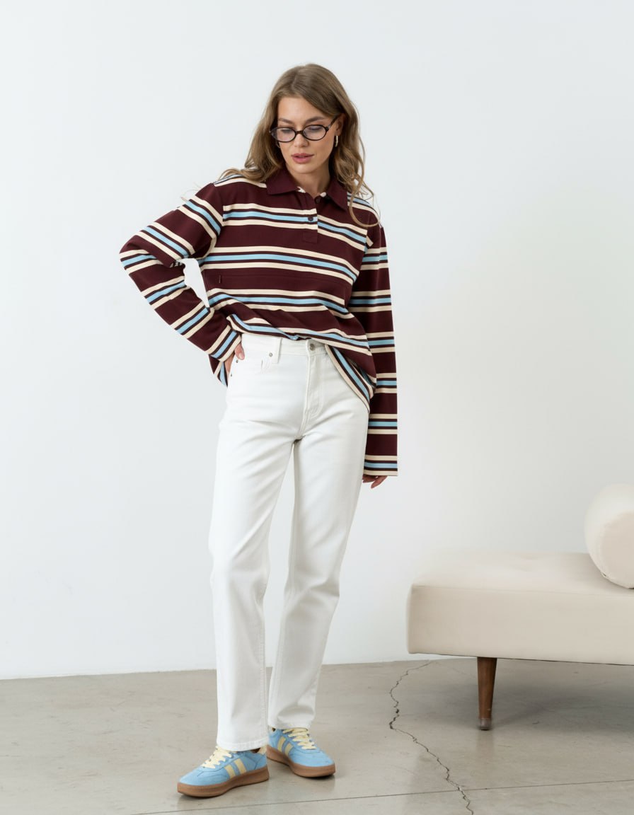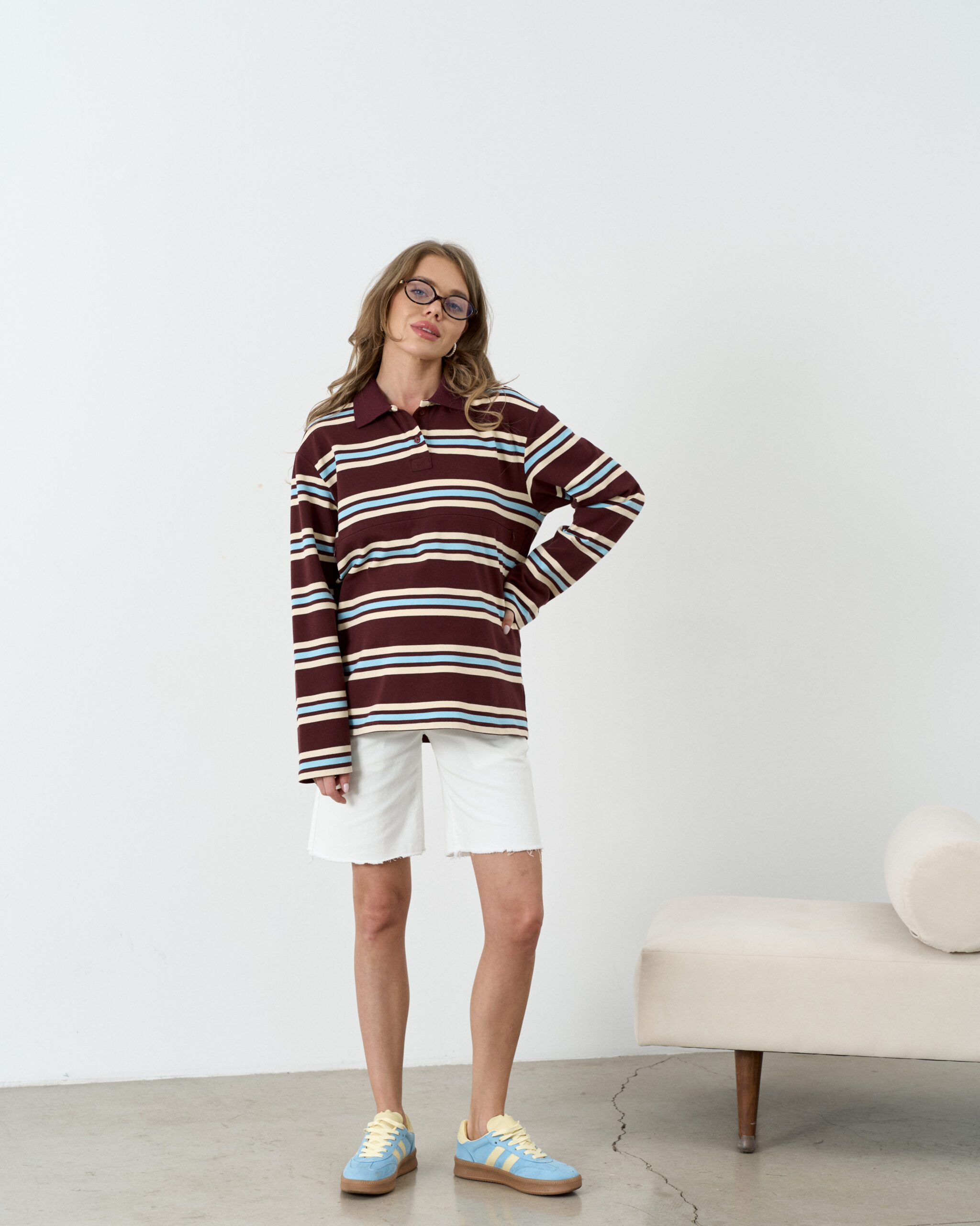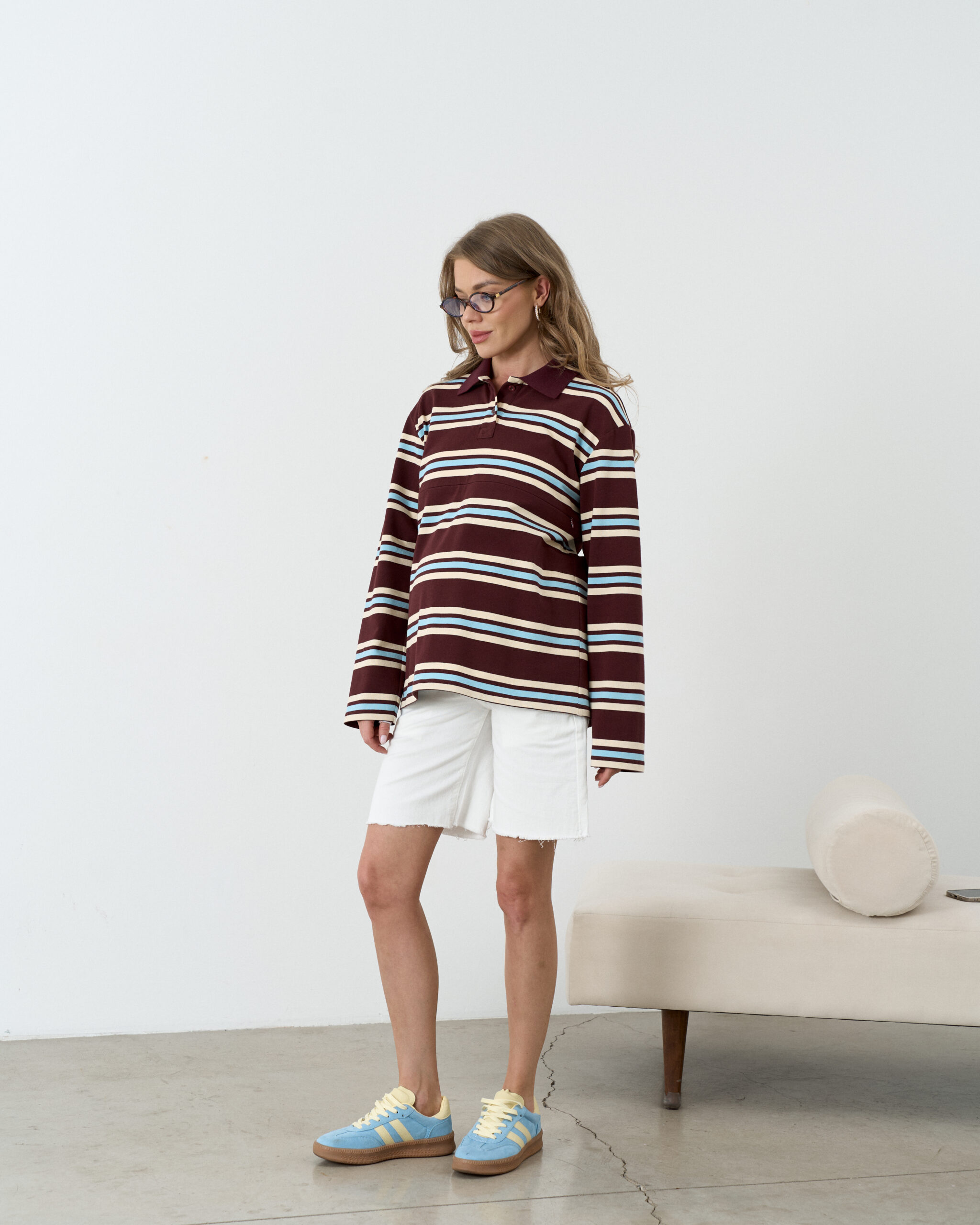 Футболка-поло актуального кроя оверсайз из хлопкового трикотажа в трендовую полоску. Подойдет для любого срока беременности и после. Для кормления малыша выполнена удобная горизонтальная молния.
