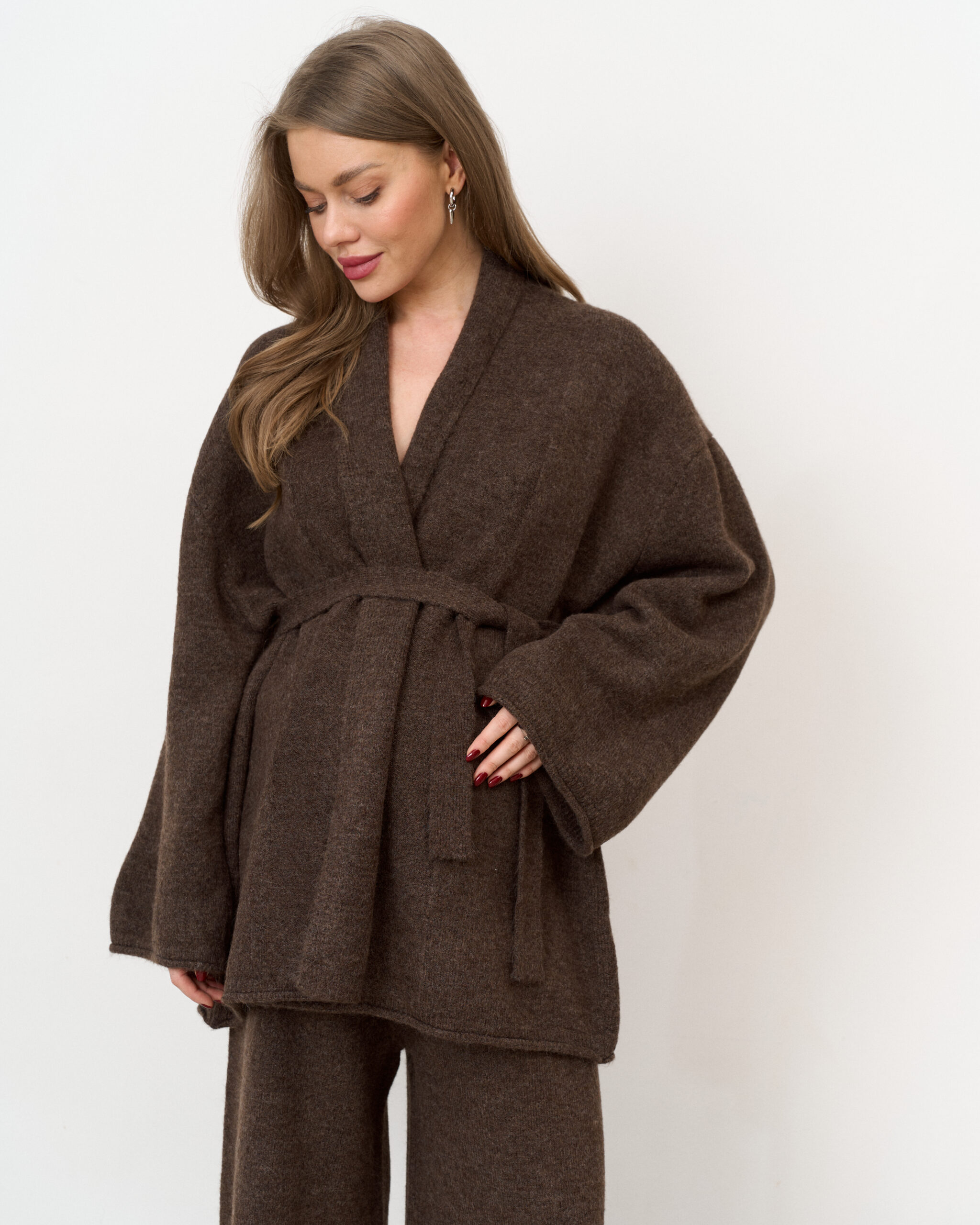 Стильный трикотажный костюм, состоящий из брюк свободного кроя и кардигана-кимоно. Модный фасон стройнит и визуально вытягивает фигуру. Подойдет на весь период беременности и после.