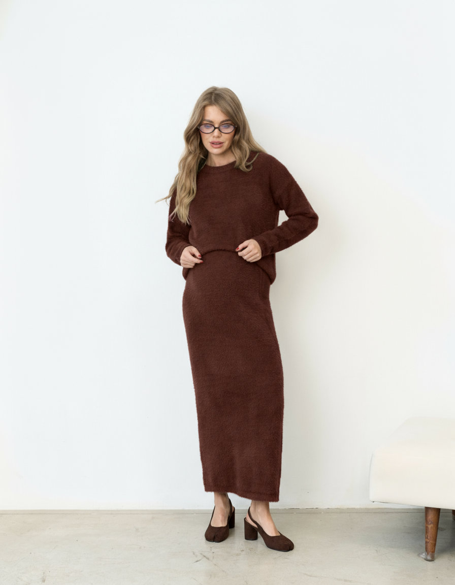 Шоколадный трикотажный пушистый комплект Kirsten