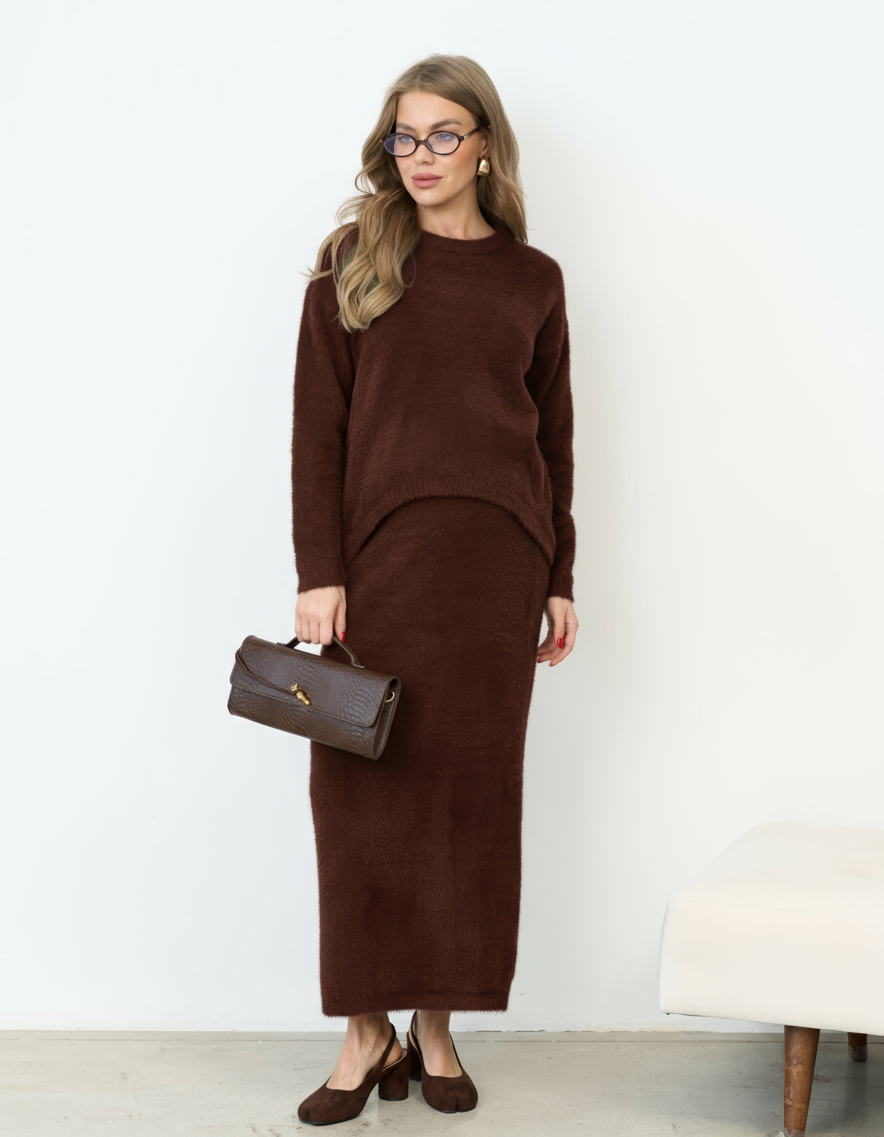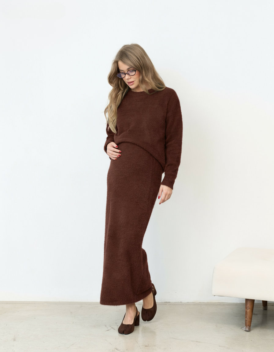 Стильный трикотажный комплект из пушистой пряжи, состоящий из макси-юбки прямого кроя и базового джемпера. Модный фасон стройнит и визуально вытягивает фигуру. Подойдет на период беременности и после.