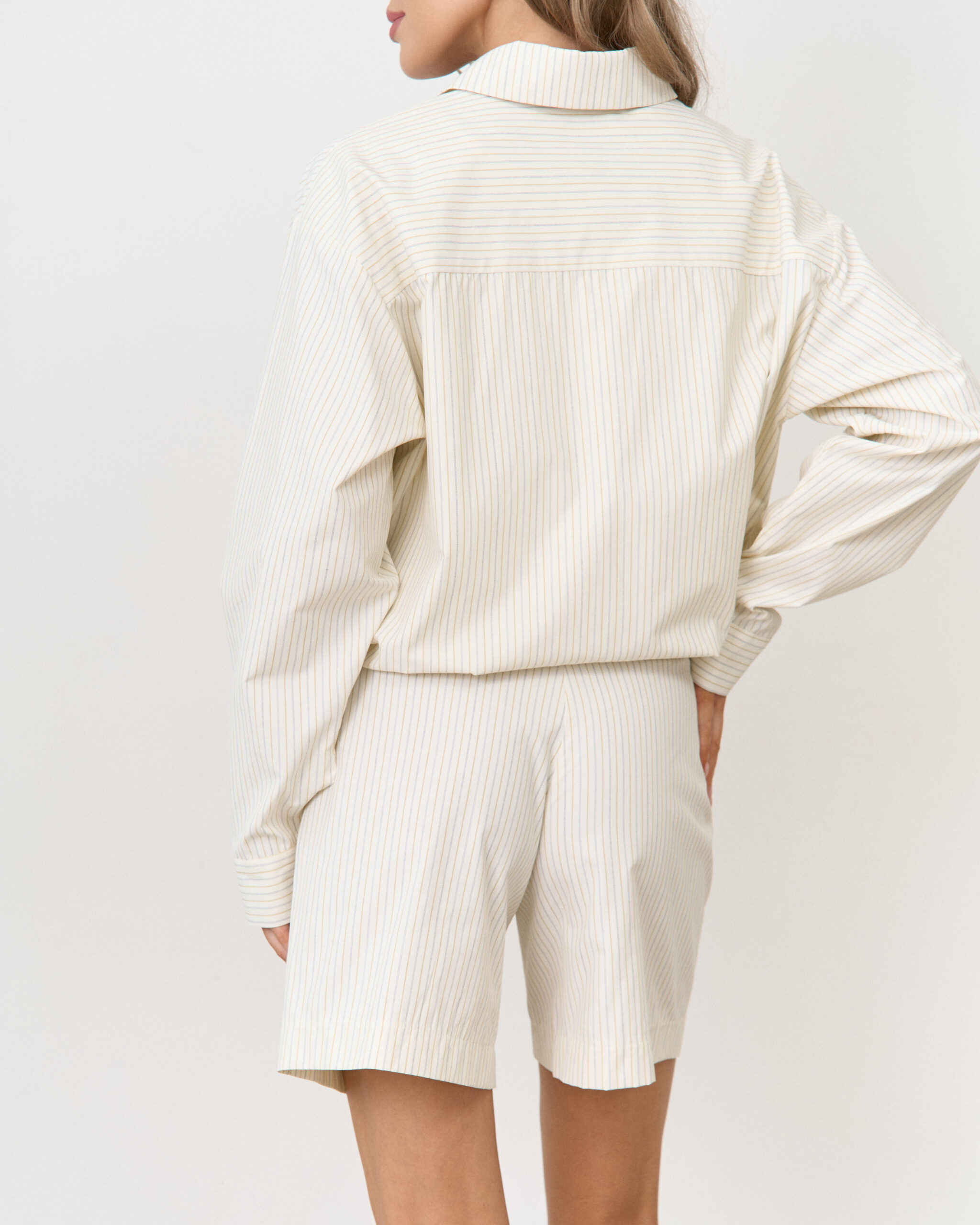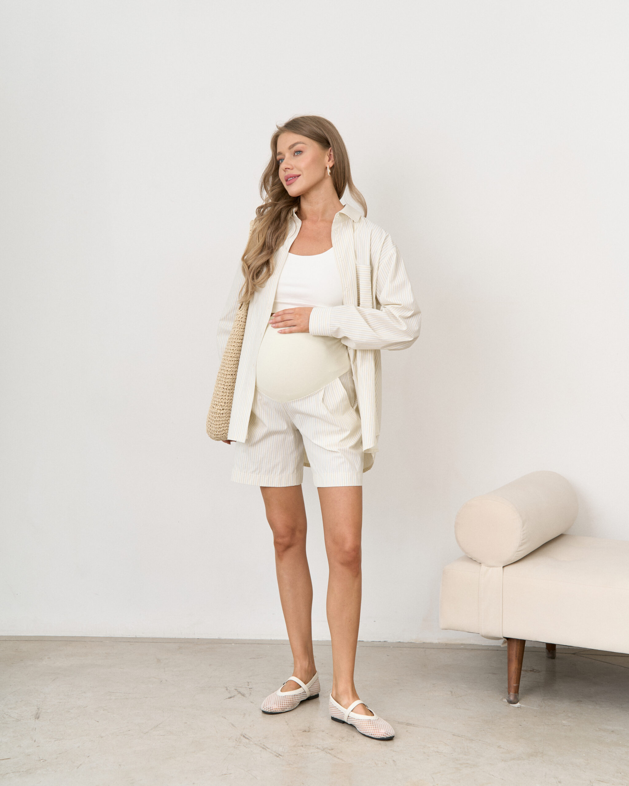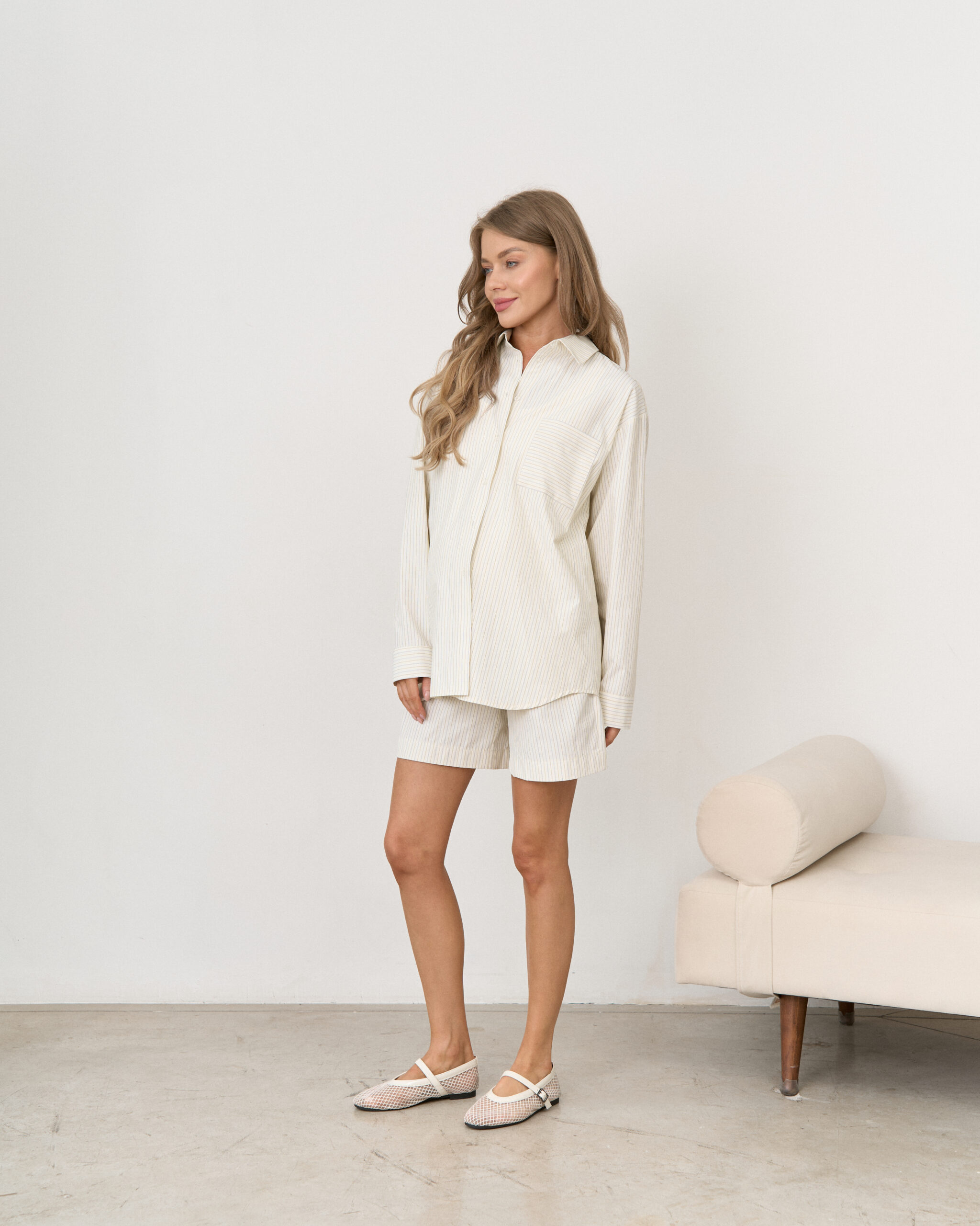 Лёгкие и очень удобные шорты прямого кроя в полоску. Модель изготовлена из приятного к телу хлопкового материала. Высокий пояс на животик регулируется перфорированной резинкой и пуговицей. В комплект к шортам вы можете приобрести рубашку Darren.