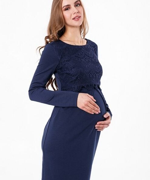 Эффектное платье для беременных и кормящих из трикотажа джерси с лифом из утонченного кружева шантильи. Зауженный к низу фасон прекрасно стройнит фигуру, а объемные встречные складки на животике красиво подчеркивают округляющиеся формы. Секрет кормления, спрятанный в удвоенных деталях лифа, позволит вам незаметно и с комфортом кормить вашего малыша.