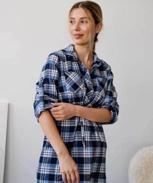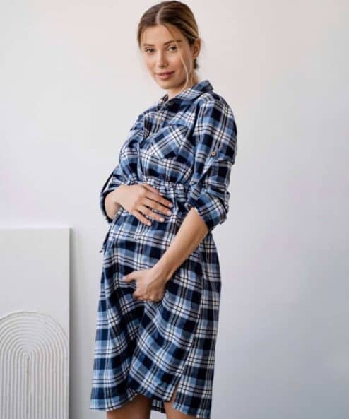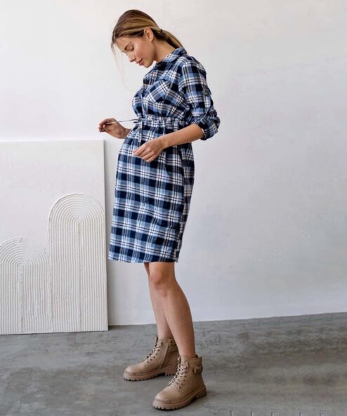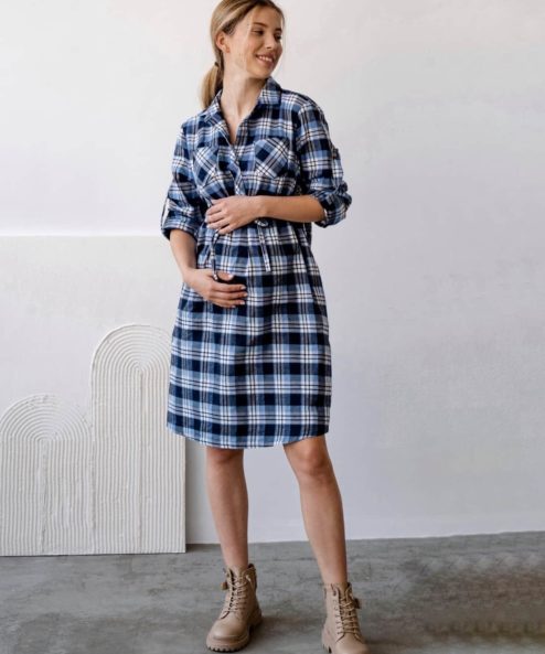 Клетчатое платье-рубашка: классический отложной воротник, длинный рукав с застежкой-паты, на груди планка с однотонными пуговицами и двумя накладными карманами спереди. Поясок в тон с затяжкой прекрасно подчеркнёт округлившийся животик. Подойдет для всего периода беременности и после. Для кормления малыша нужно расстегнуть пуговицы на передней планке.