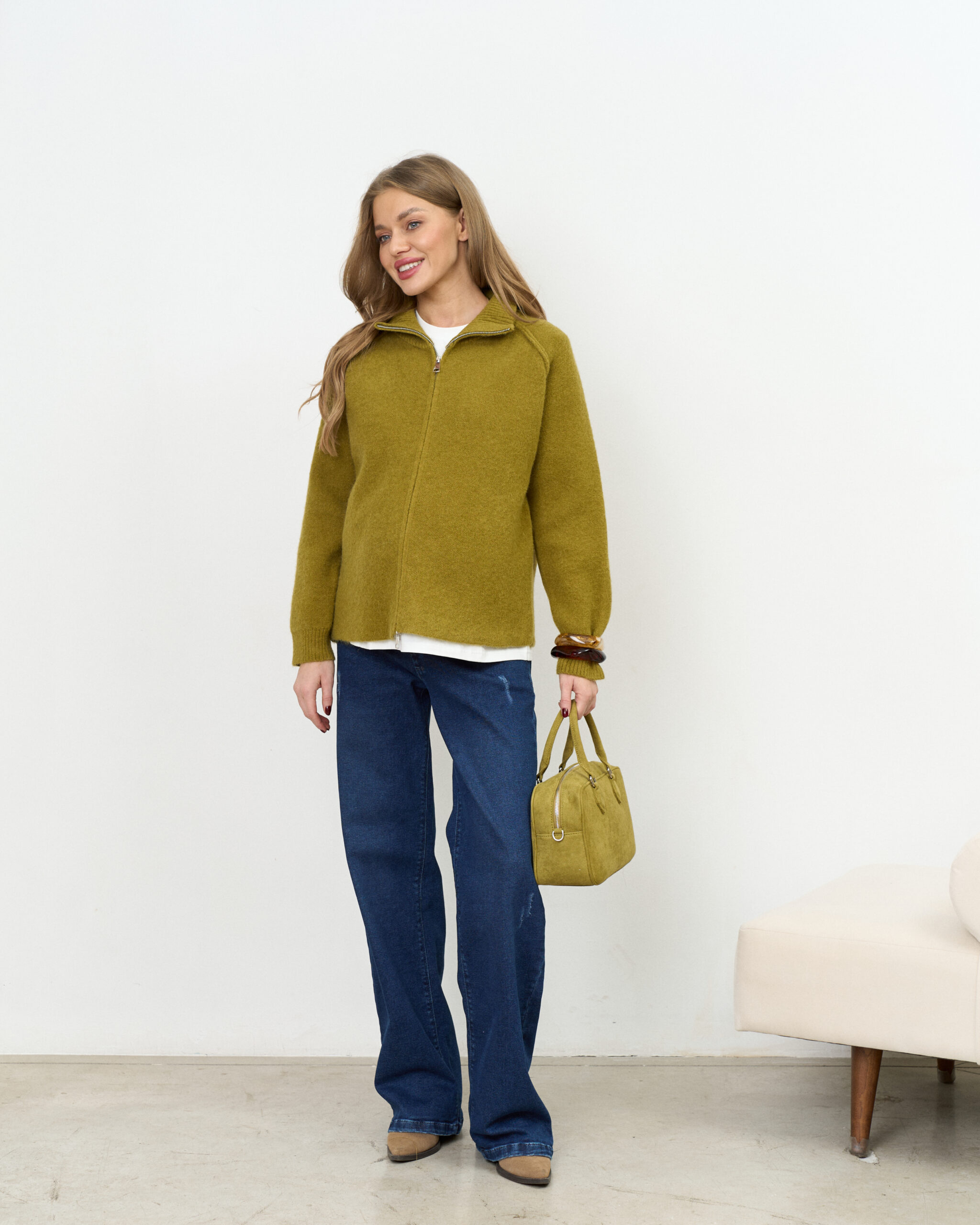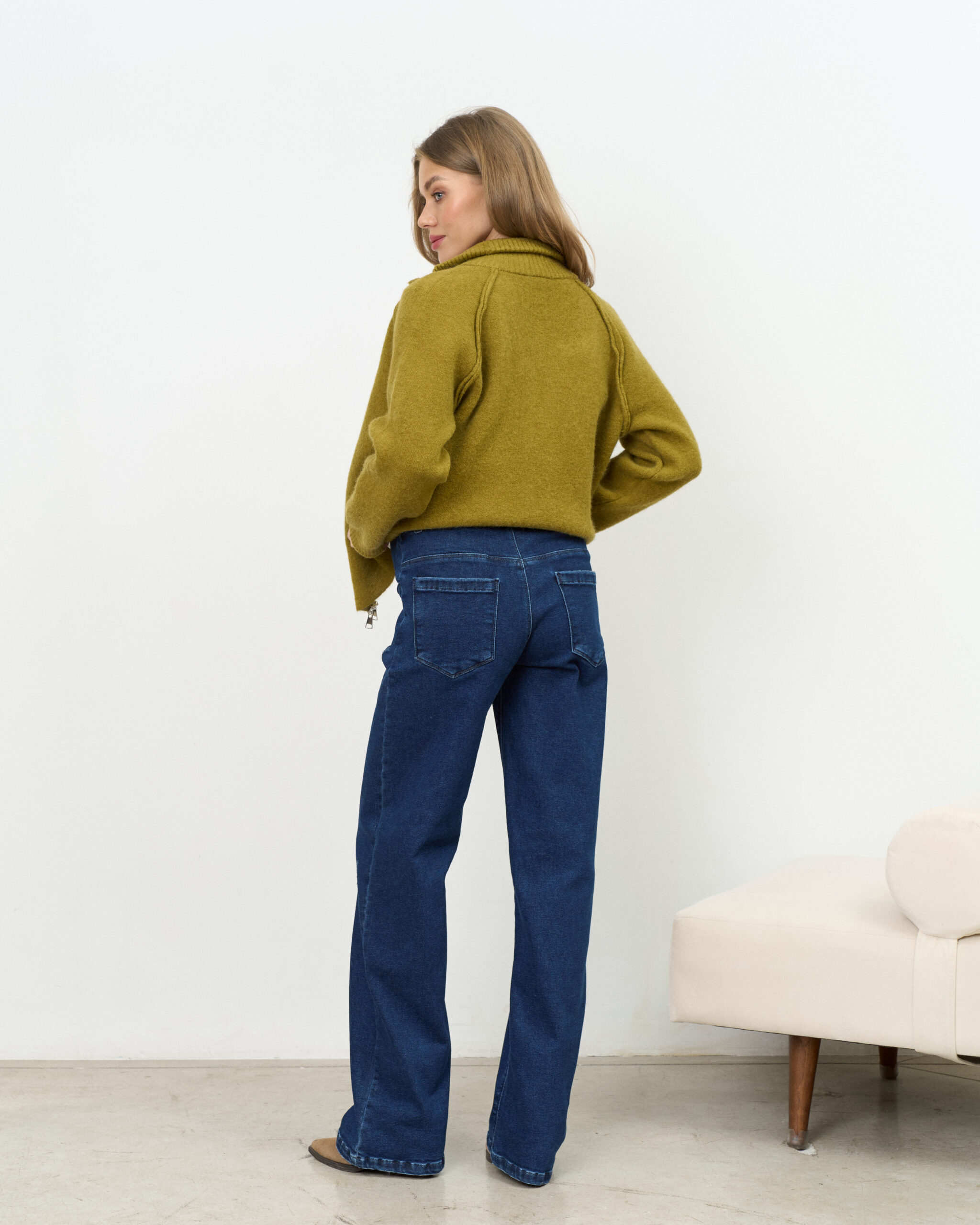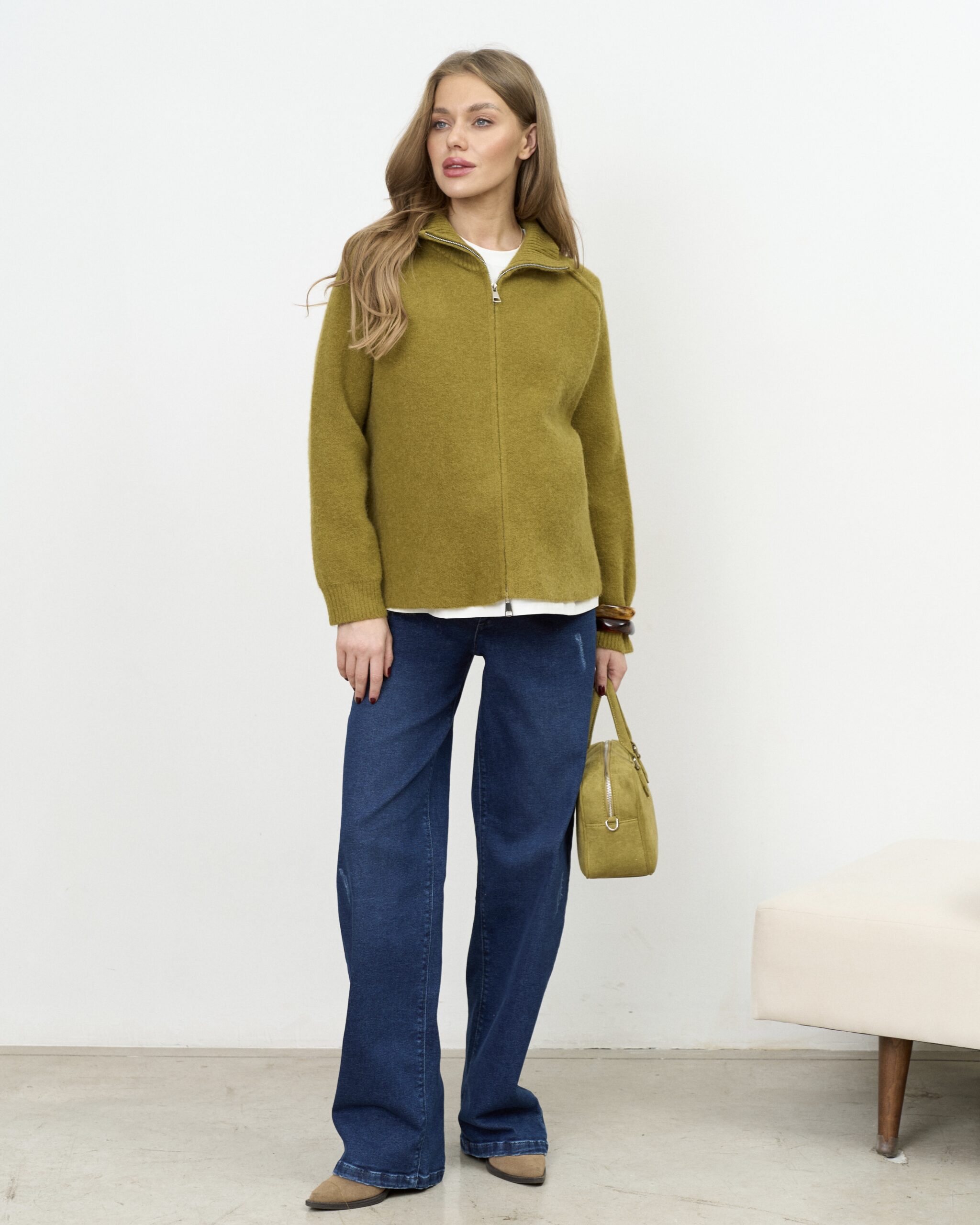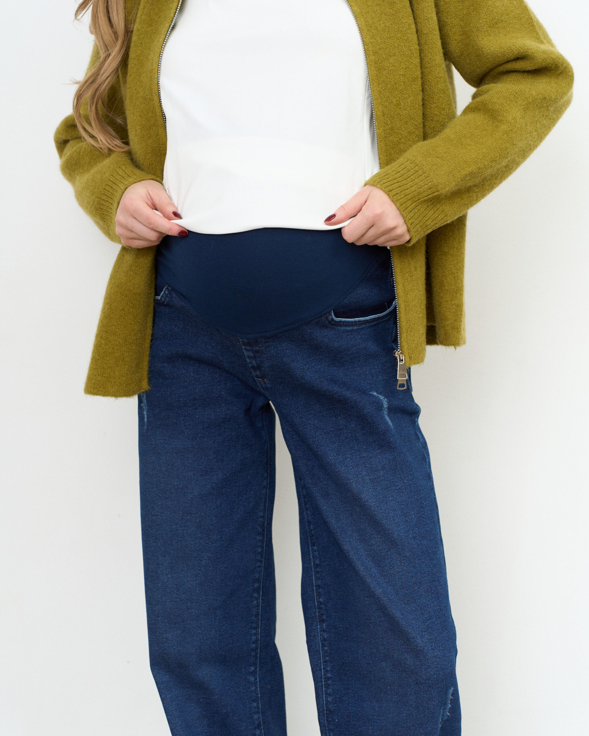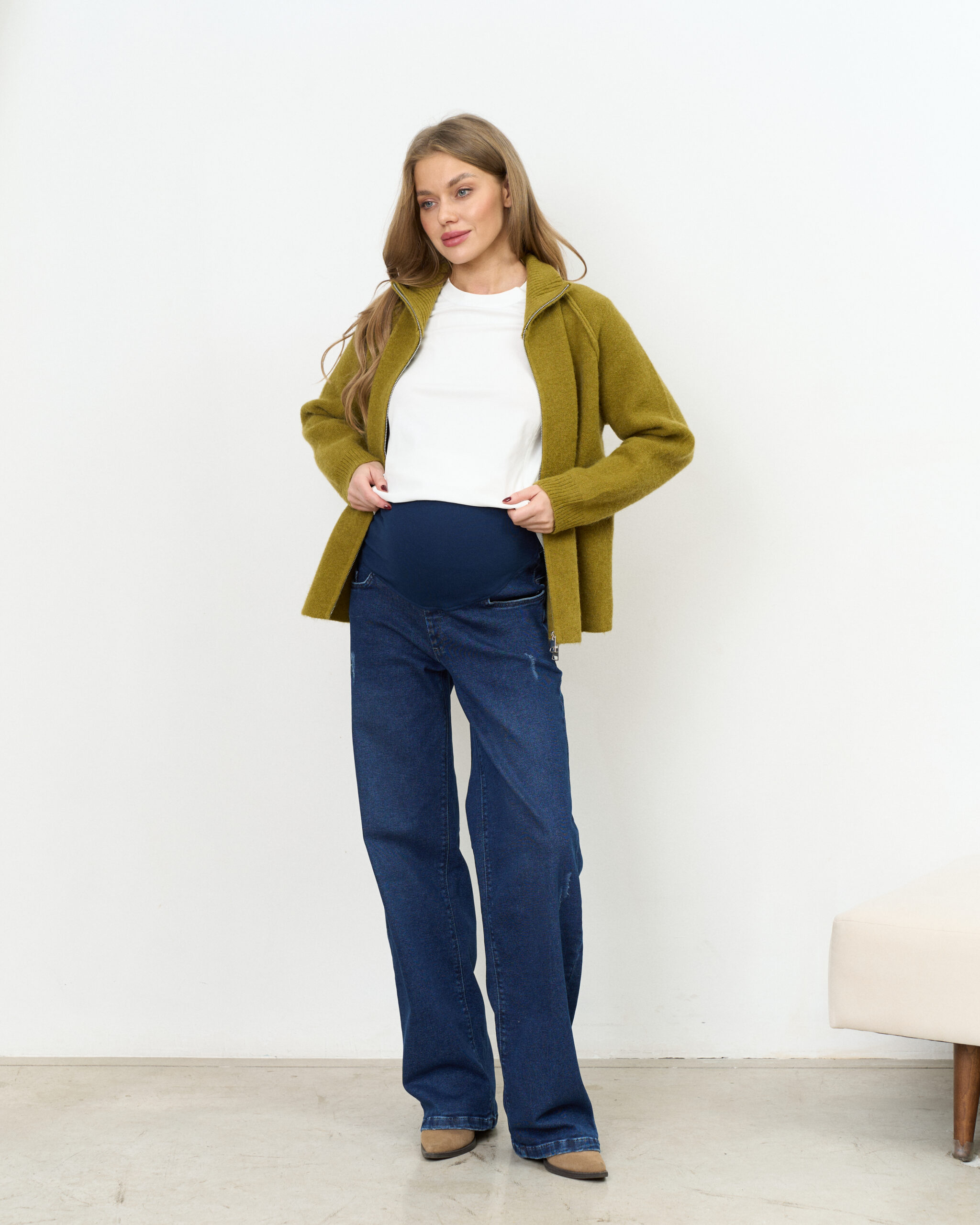 Актуальные джинсы для будущих мам прямого кроя с мягким трикотажным поясом. Подходят на весь срок беременности.