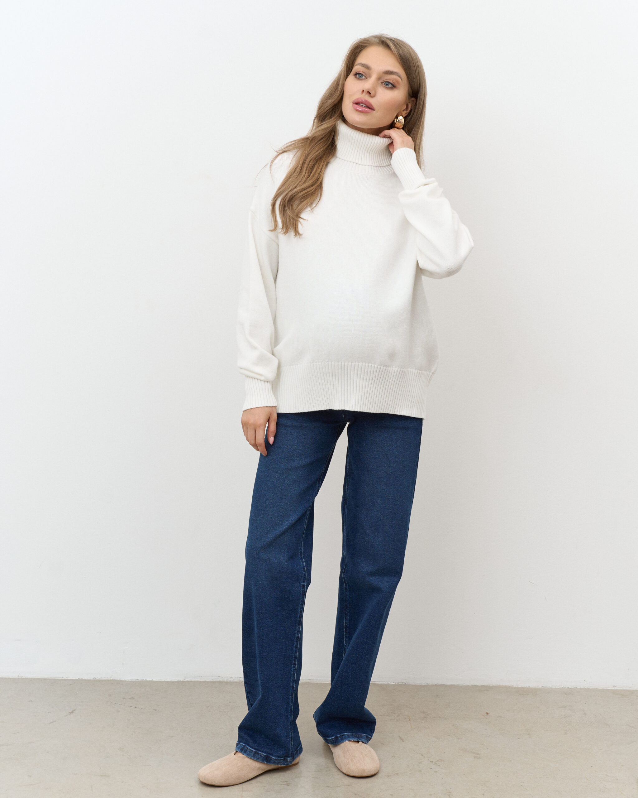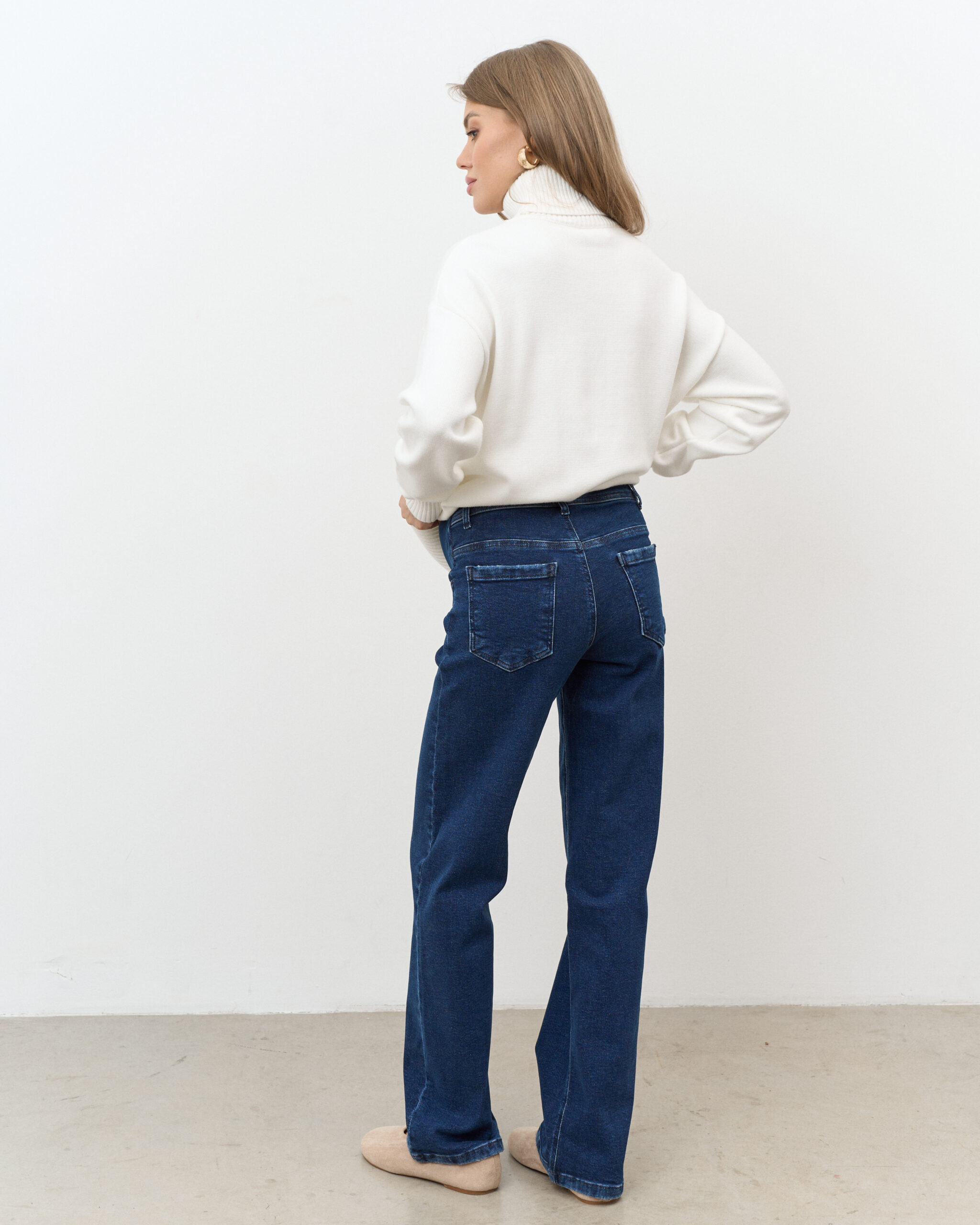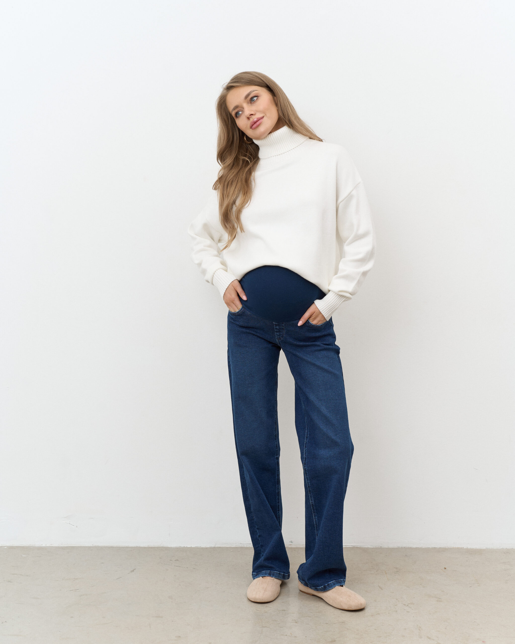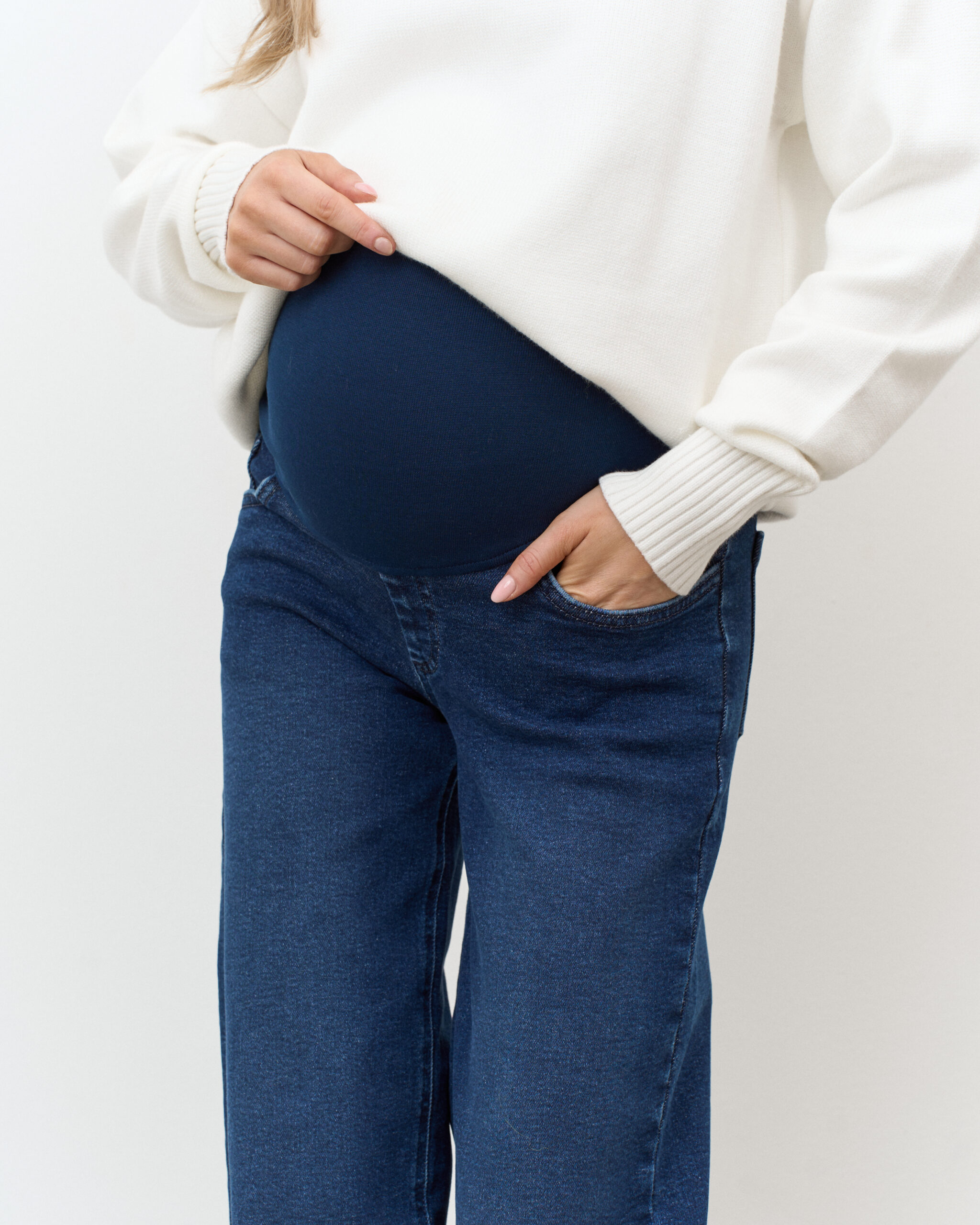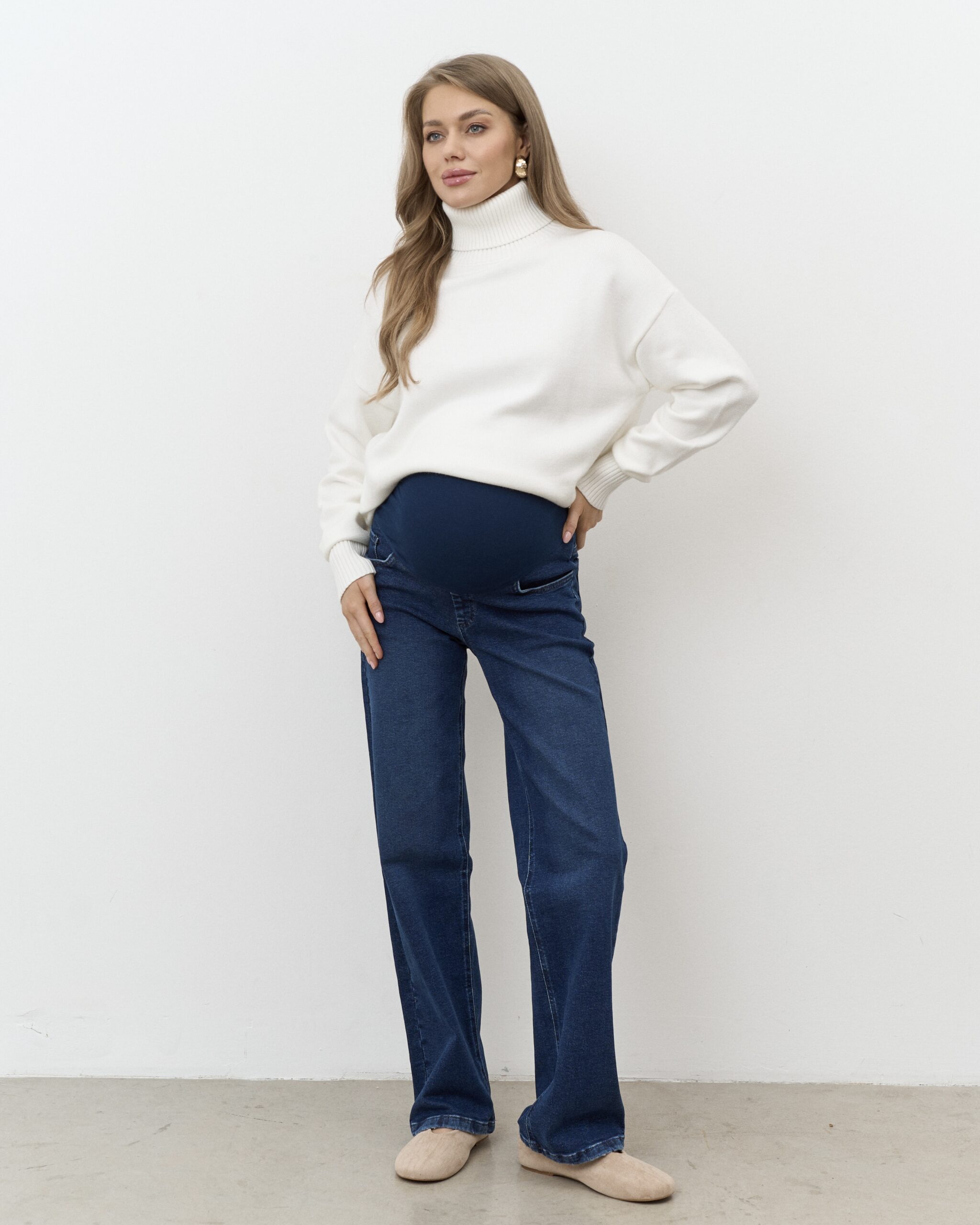 Актуальные джинсы для будущих мам прямого кроя с мягким трикотажным поясом. Подходят на весь срок беременности.