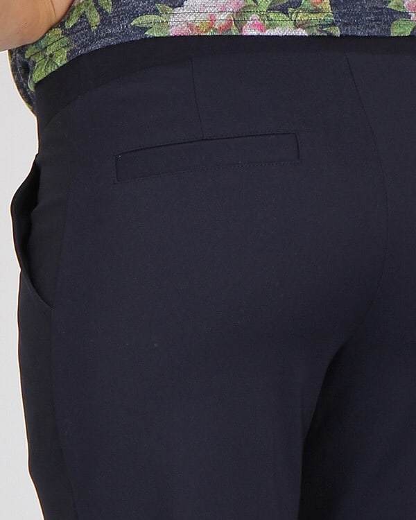 Стильные классические брюки модной длины «до щиколотки». Модель выполнена из стрейчевого коттона, который прекрасно держит строгую форму. Зауженный к низу фасон, в сочетании с заутюженными стрелками, прекрасно стройнит фигуру. На задней половинке брюк — прорезной карман-обманка. Бандажный пояс хорошо поддерживает животик и позволяет носить эту модель и после беременности.