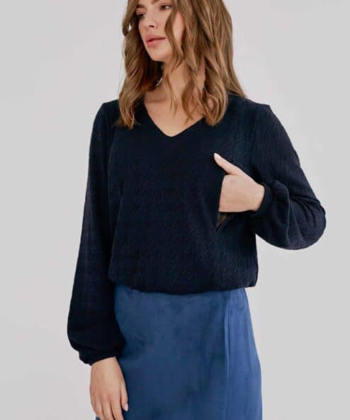 Джемпер для будущих и кормящих мам, выполненный из ажурного вязаного трикотажа. Изюминка джемпера — объемные рукава, актуальные в этом сезоне. Они позволят создать женственный образ в сочетании с любыми низами, а V-вырез красиво подчеркнёт шею. Секреты для кормления удачно замаскировались в нагрудных рельефах (незаметные потайные молнии). На рукавах и снизу джемпера удобные манжеты.