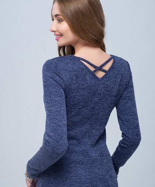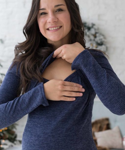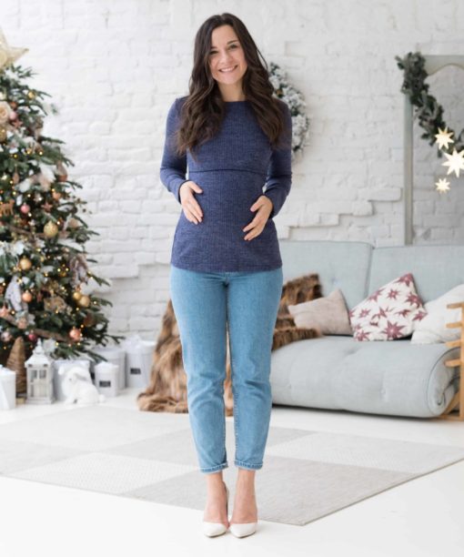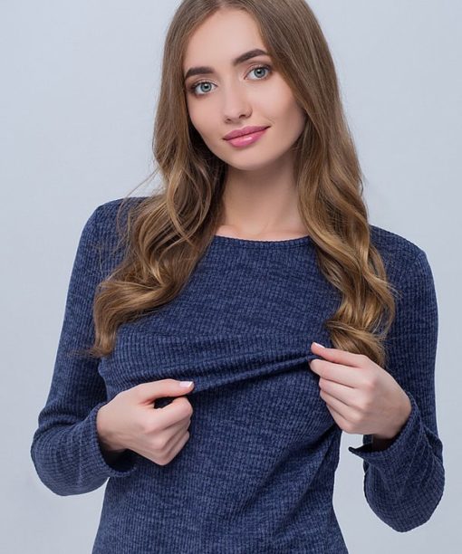 Женственный лонгслив для беременных и кормящих из теплого трикотажа-резинка с меланжевым рисунком. Облегающий фасон с очень интересным решением на спинке — V-образным вырезом с перекрещенными бейками. Очень удобный секрет для кормления (верхняя деталь полки заходит на нижнюю) делает эту модель прекрасным выбором на все случаи жизни.