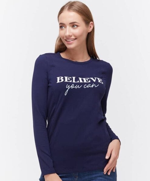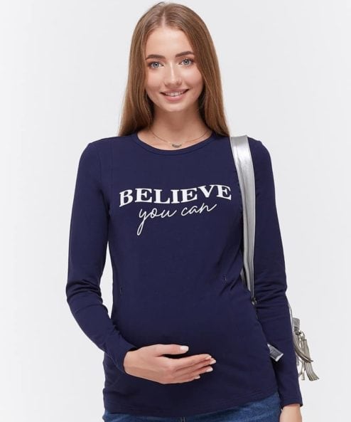 Трикотажный лонгслив для беременных и кормящих с принтом на груди.