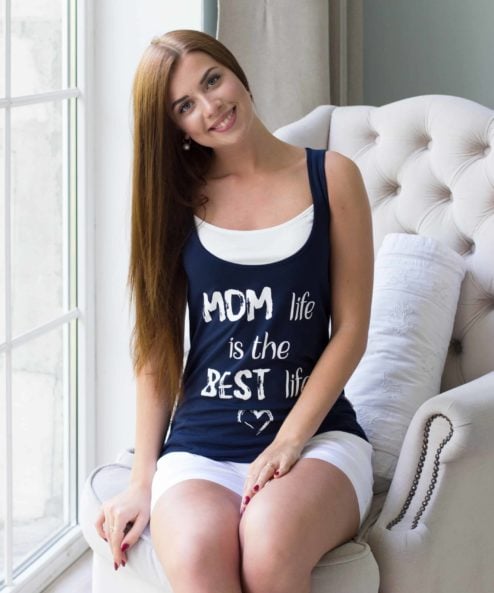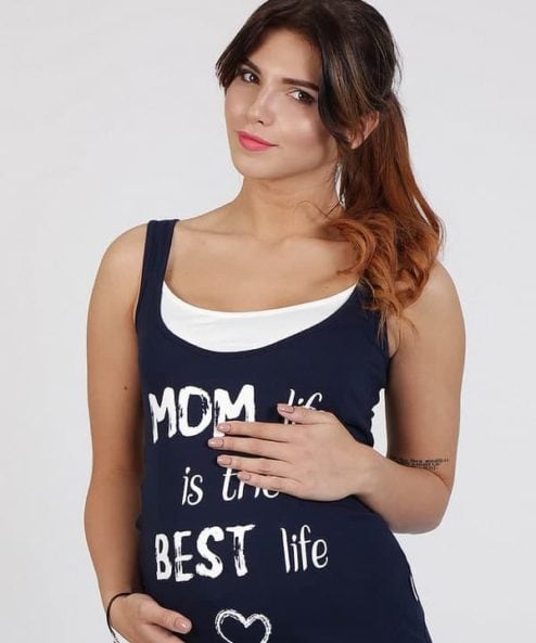 Облегающая майка для беременных и кормящих из стрейчевого хлопкового трикотажа. Удобный секрет для кормления (глубокий вырез горловины продублирован внутренним коротким топиком), стильная расцветка и яркий принт на полочке «Moms life» сделают эту модель вашей верной спутницей на все теплое время года.