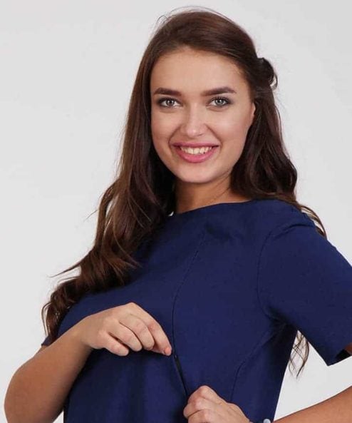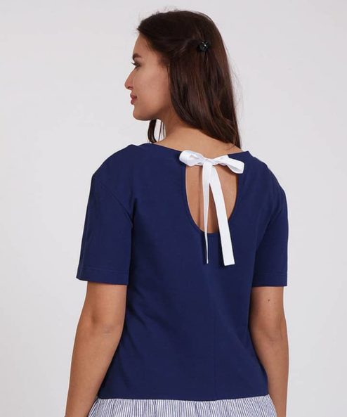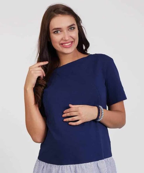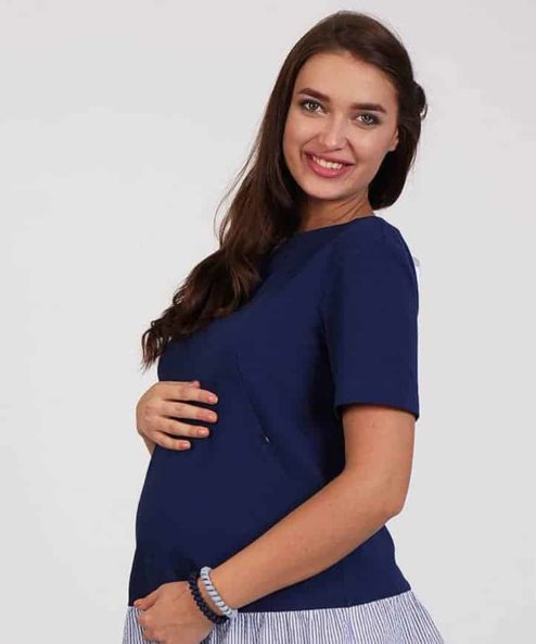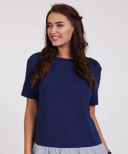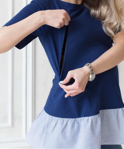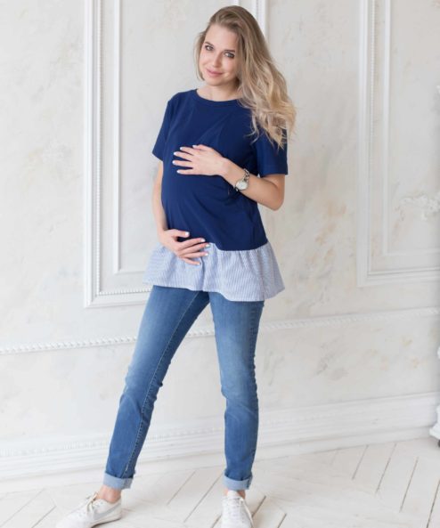 Отличный вариант на каждый день — модная туника для беременных и кормящих из комбинации хлопкового трикотажа и легкой ткани-крэш в полоску. Свободный верх из трикотажа отлично маскирует и адаптируется к изменяющимся формами фигуры, а оборка по низу из полоски и капелька на спинке с завязками из репсовой тесьмы отлично дополняют и украшают изделие. Незаметный и такой удобный секрет комрления — потайные молнии в нагрудных рельефах.