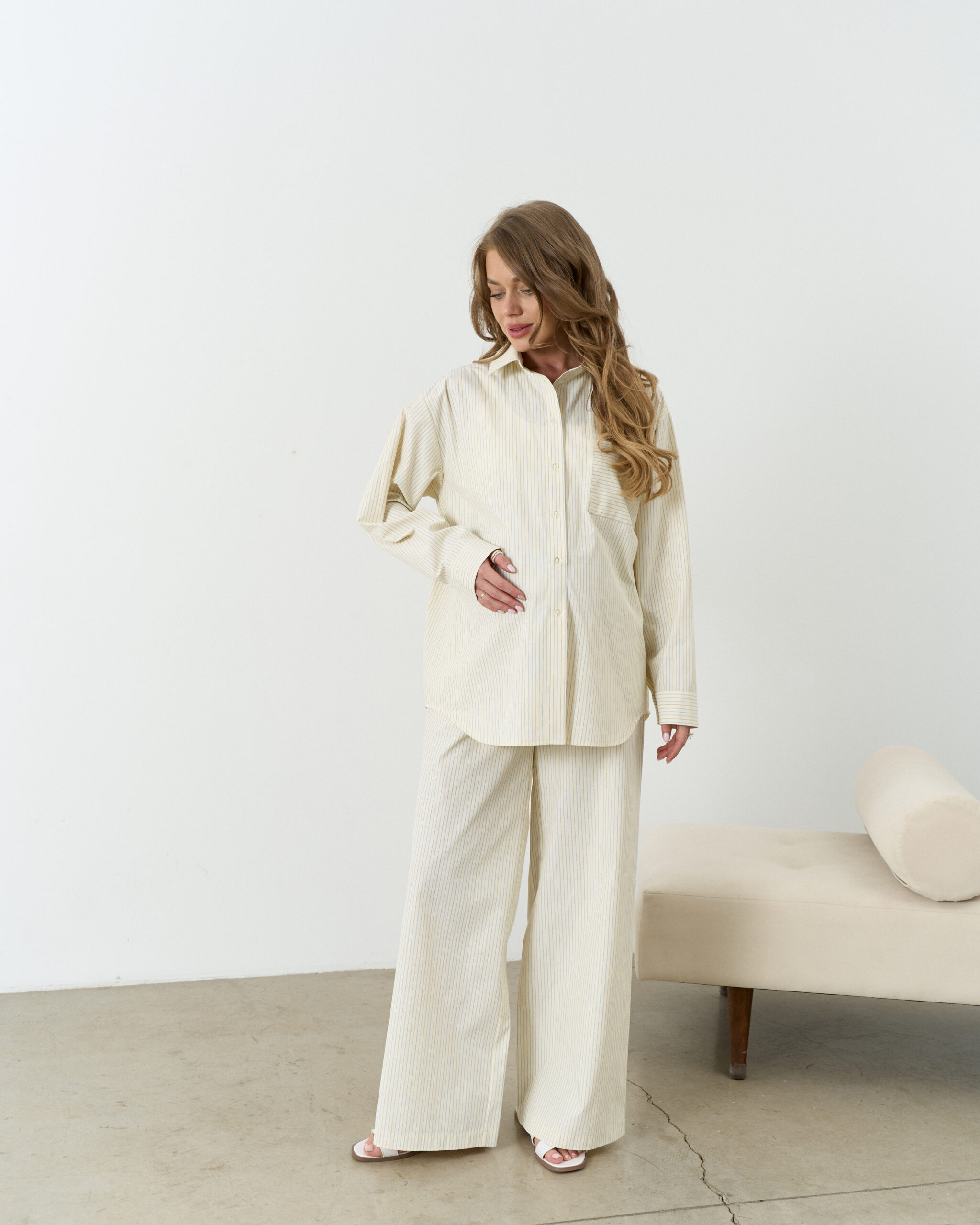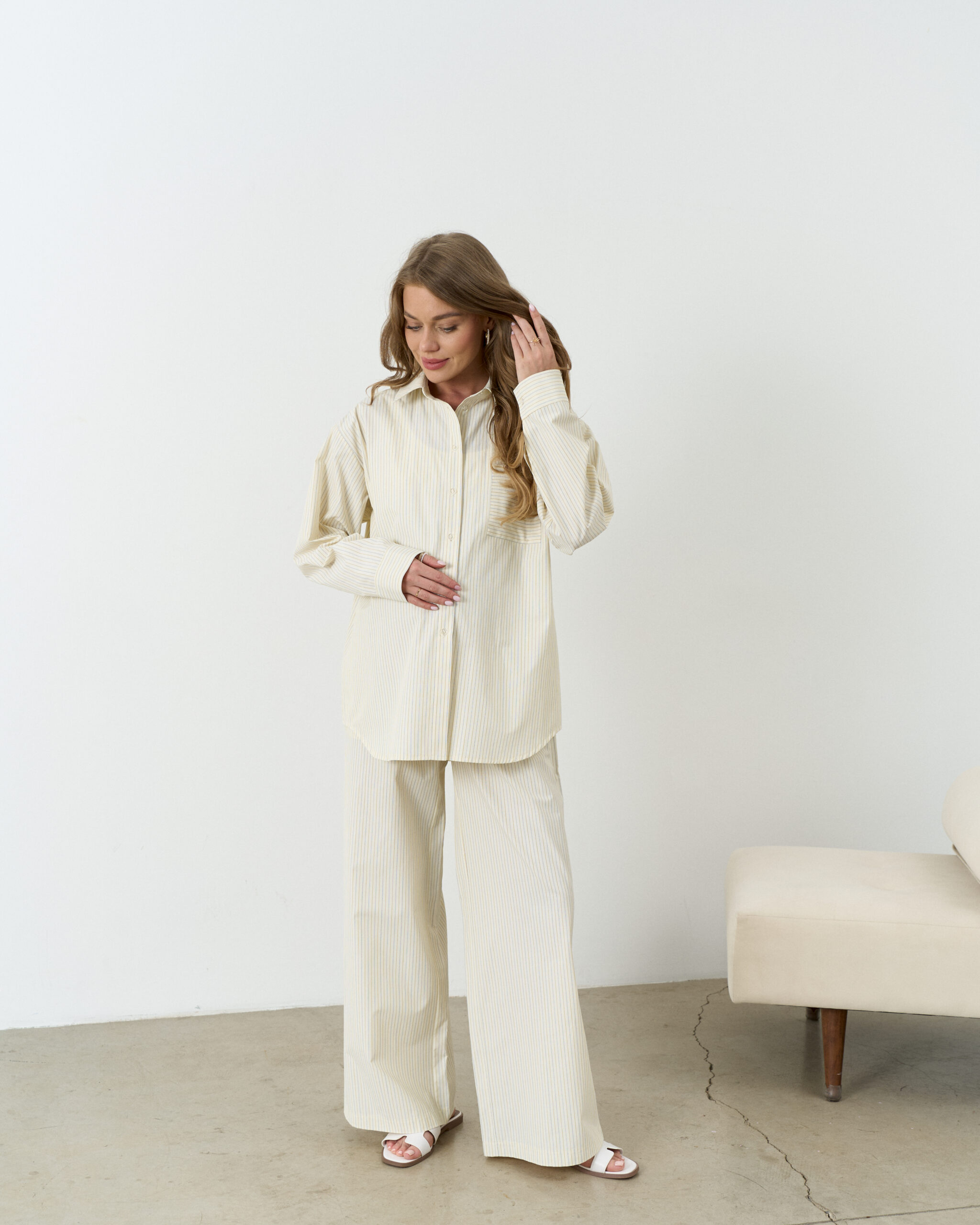 Подойдут на весь период беременности и после. В комплект к брюкам вы можете приобрести рубашку Darren.