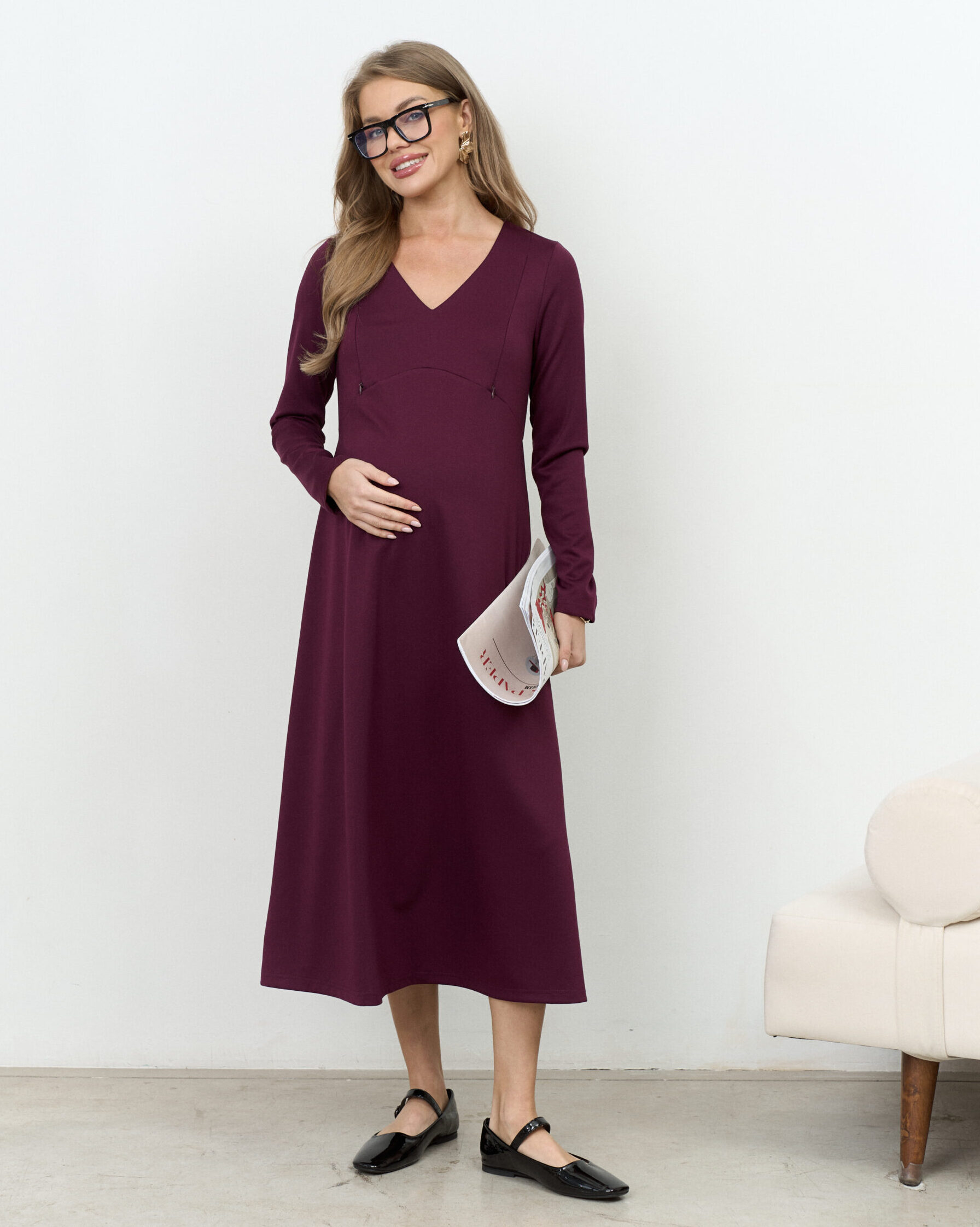 Женственное базовое платье для будущих и кормящих мам из трикотажа джерси. Особенности модели: актуальная длина, V-вырез, юбка-колоколи резинка сзади по талии. Для кормления малыша — молнии в нагрудных рельефах. Платье также отлично подойдет для мероприятий и фотосессий.