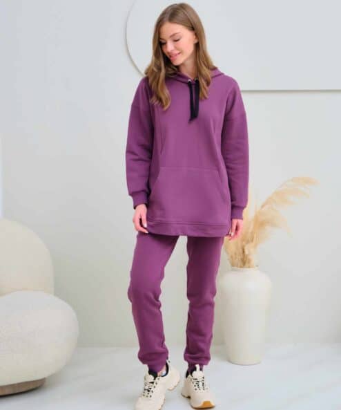 Брючки для будущих и кормящих мам из футера высшего качества «пенье» с начесом. Пояс брюк мягкий и эластичный, что позволяет носить их на любом сроке беременности и после. Бандажный пояс и отделка штанин выполнены из рибаны. В комплекте с брючками вы можете приобрести худи Sport