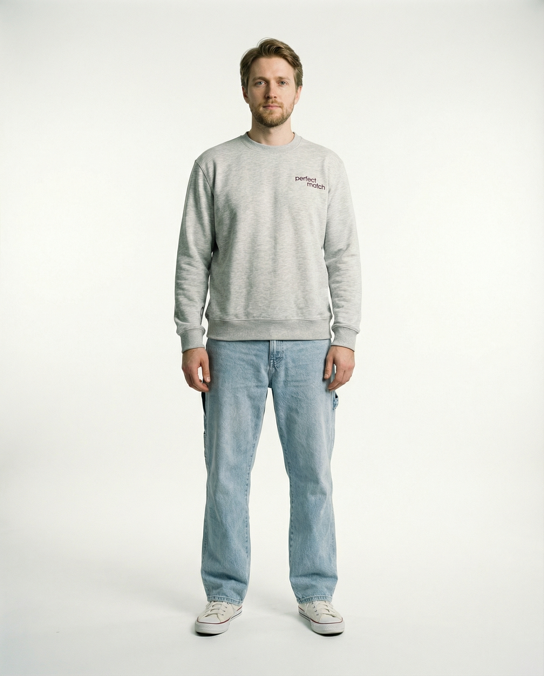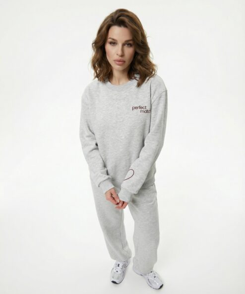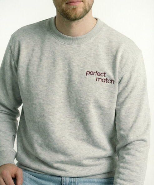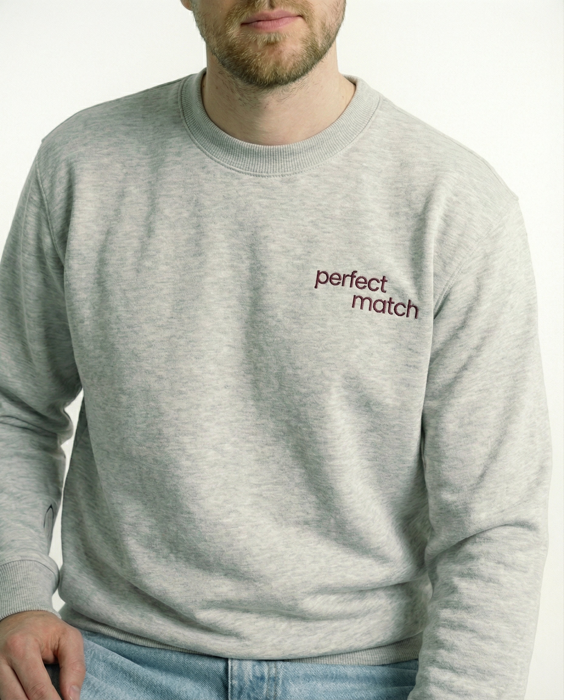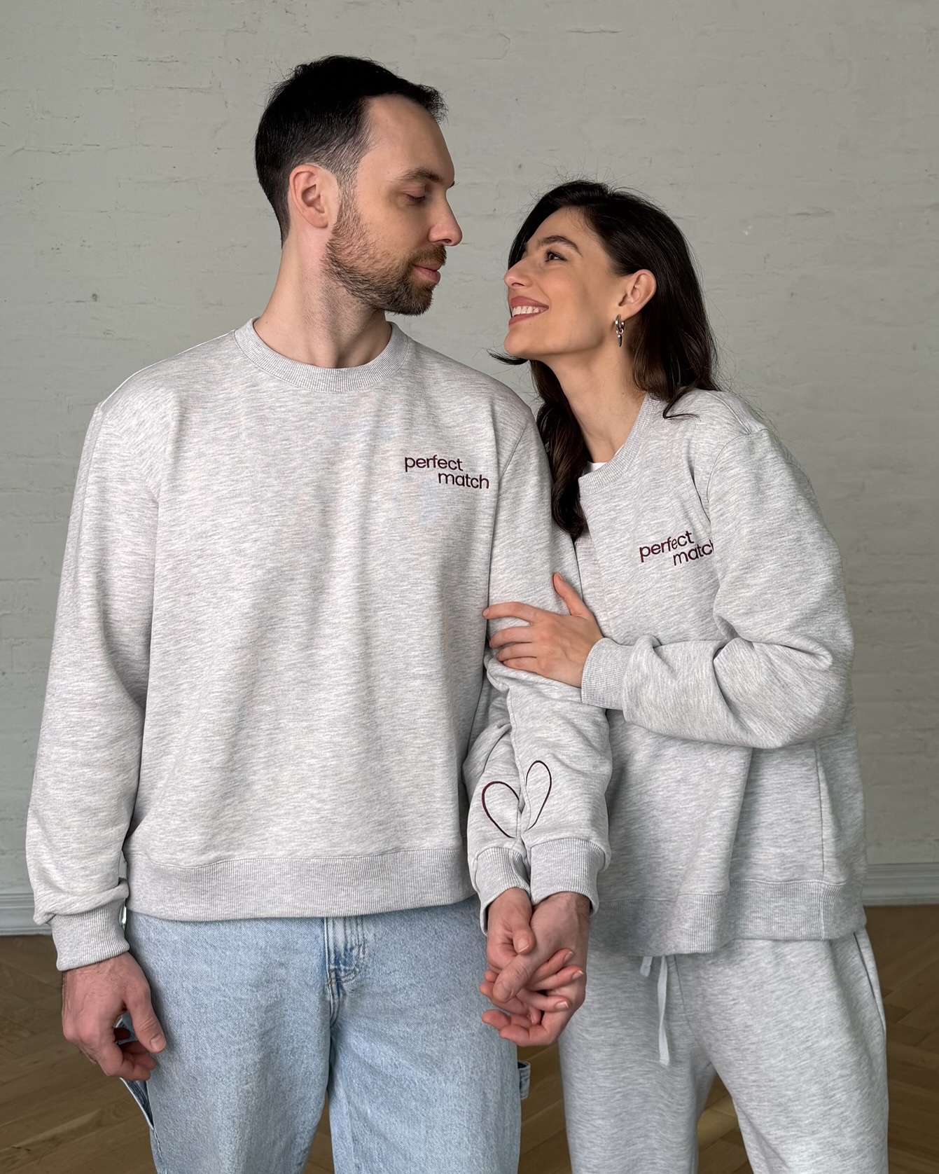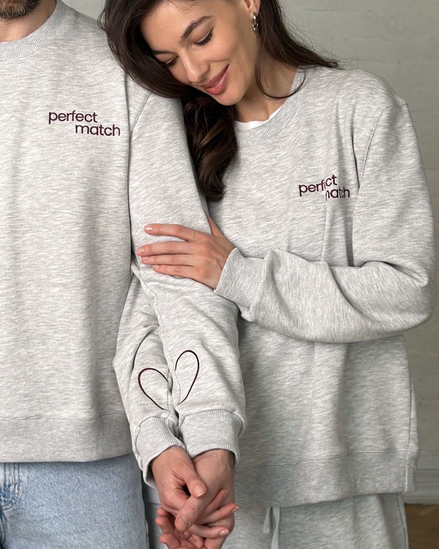 Базовая модель свитшота из петельного футера. Крой унисекс делает свитшот, подходящим как для мужчин, так и для женщин. Фишка модели — вышивка Perfect match (идеальное совпадение, пара) на груди и половинки сердечек на рукавах. Когда вы берете своего бойфренда / девушку за руку, половинки сердечек складываются в целое.