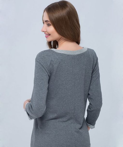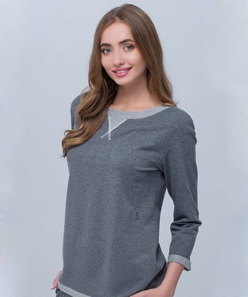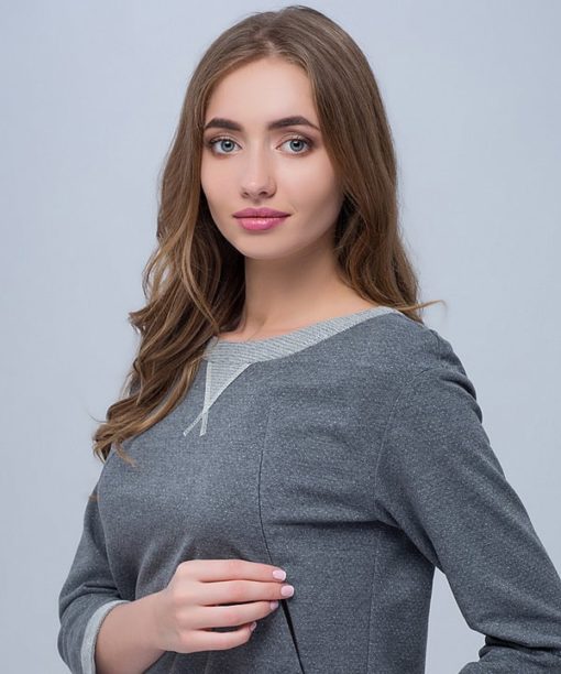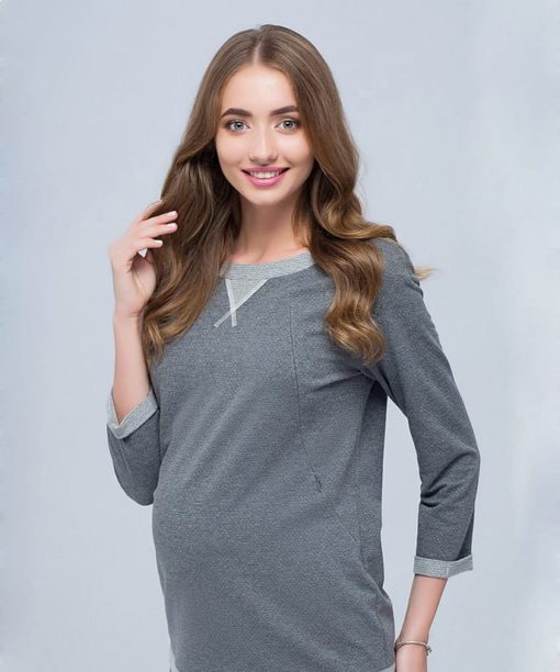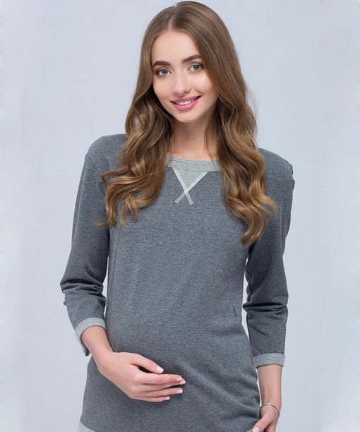 Универсальный всесезонный свитшот для беременных и кормящих свободного фасона с рукавом 3/4 из трикотажа двунитка с люрексом. Такие модные элементы как использование изнанки с лицевой стороны и отделка горловины кассическим V-образным элементом, в сочетании с потайными молниями в нагрудных рельефах, создают стильную и комфортную модель.