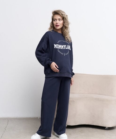Брюки актуального прямого кроя для будущих и кормящих мам. Ткань — футер-трехнитка высшего качества «пенье». Пояс брюк мягкий и эластичный, под живот, что позволяет носить их на любом сроке беременности и после. Бандажный пояс выполнен из рибаны. В комплект к брюкам вы можете приобрести темно-синее худи Juna или синий свитшот Mommyland.