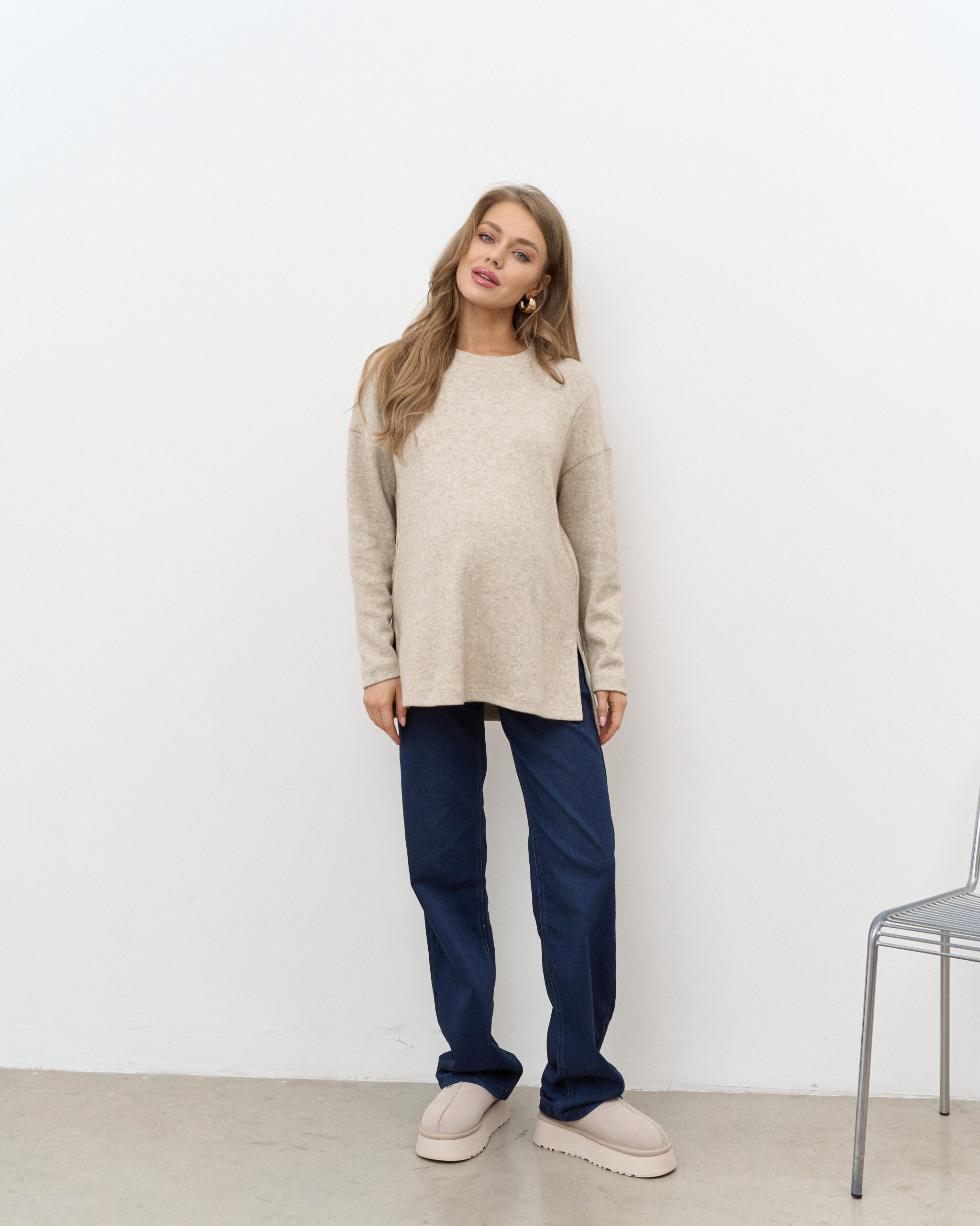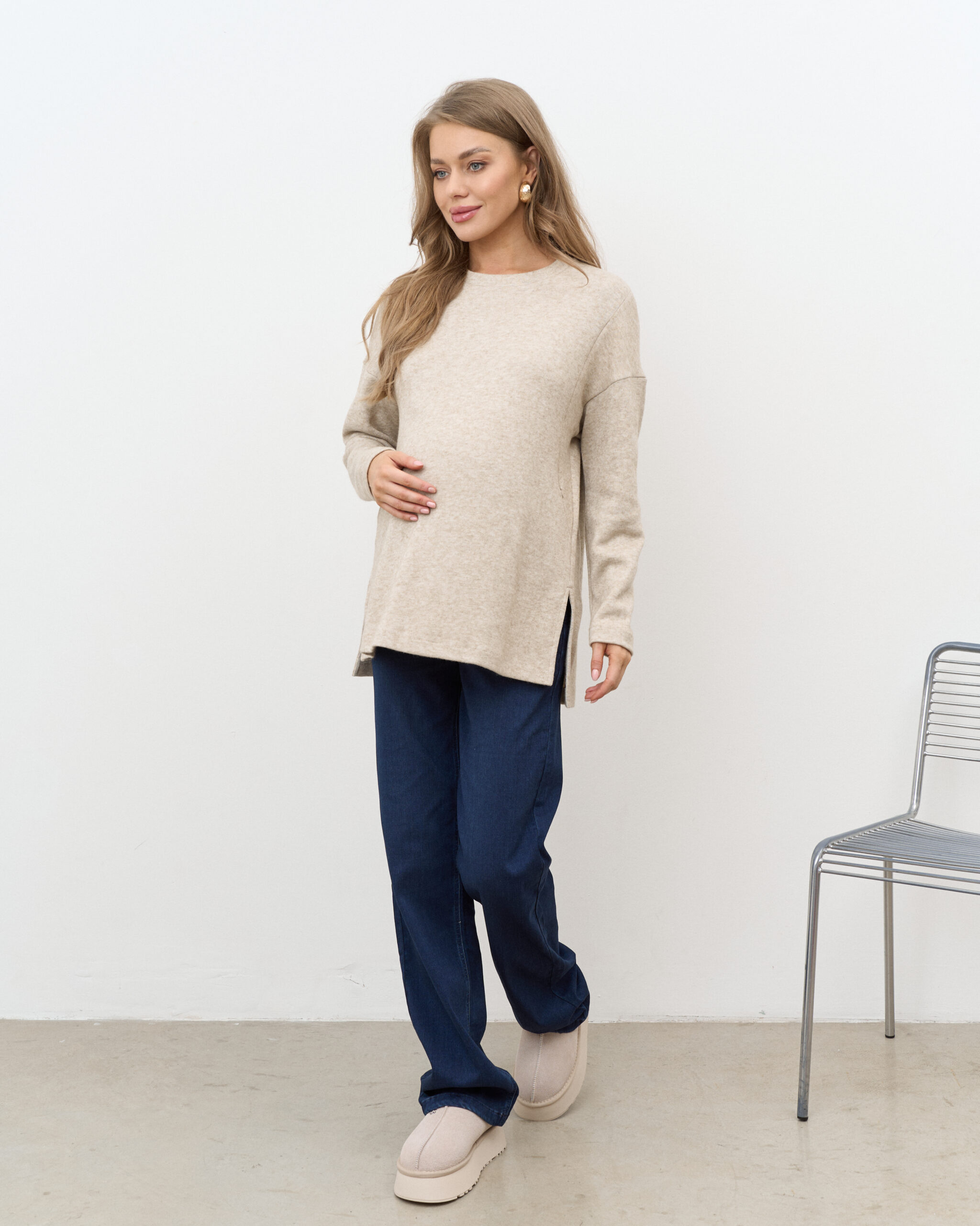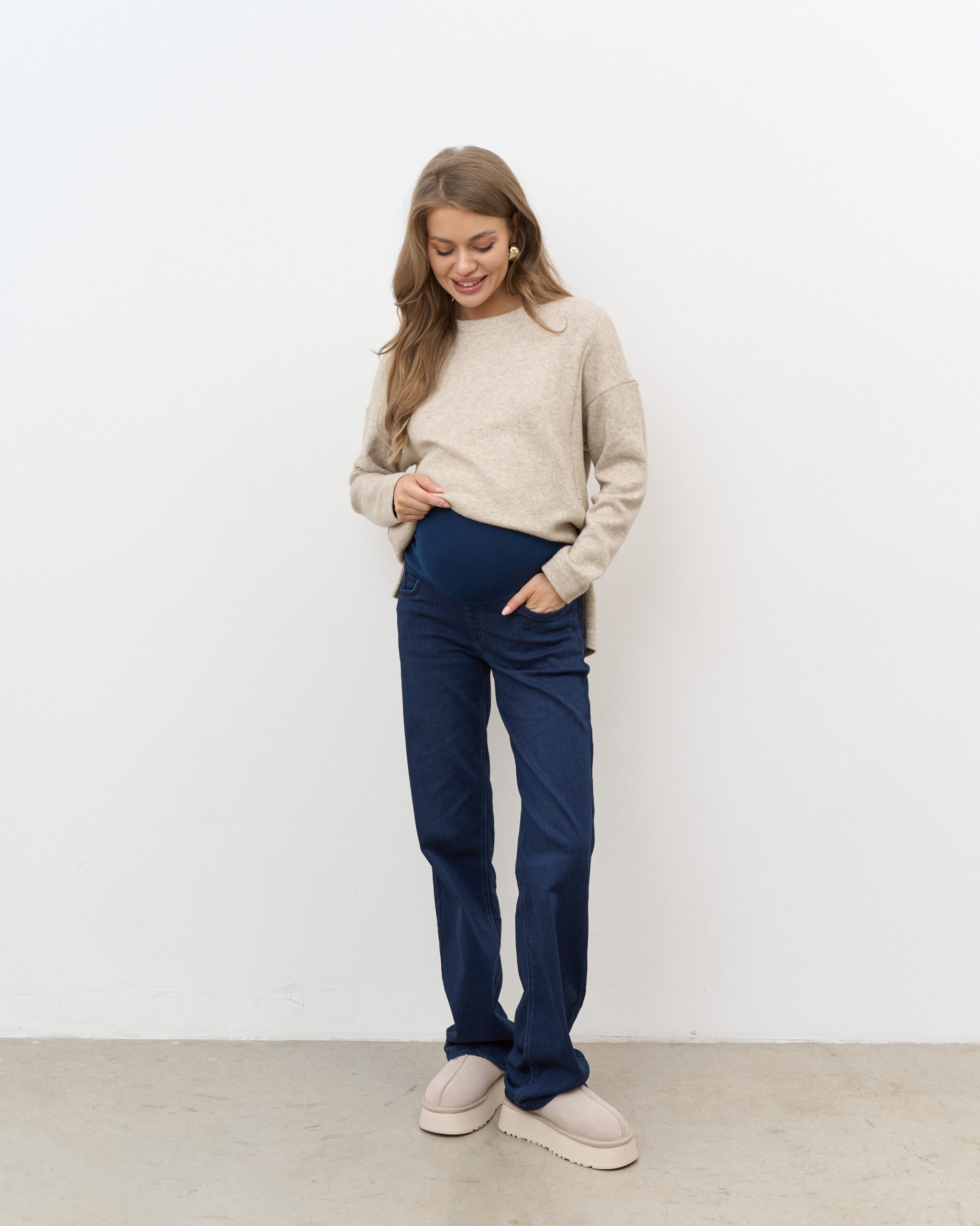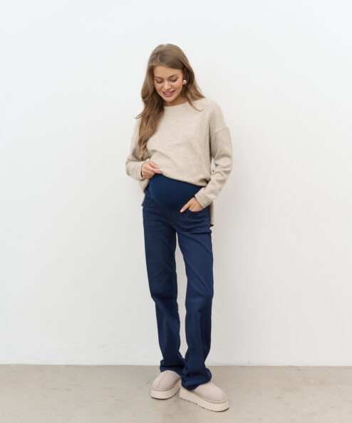 Утепленные джинсы для будущих мам прямого кроя с мягким трикотажным поясом. Подходят на весь срок беременности.