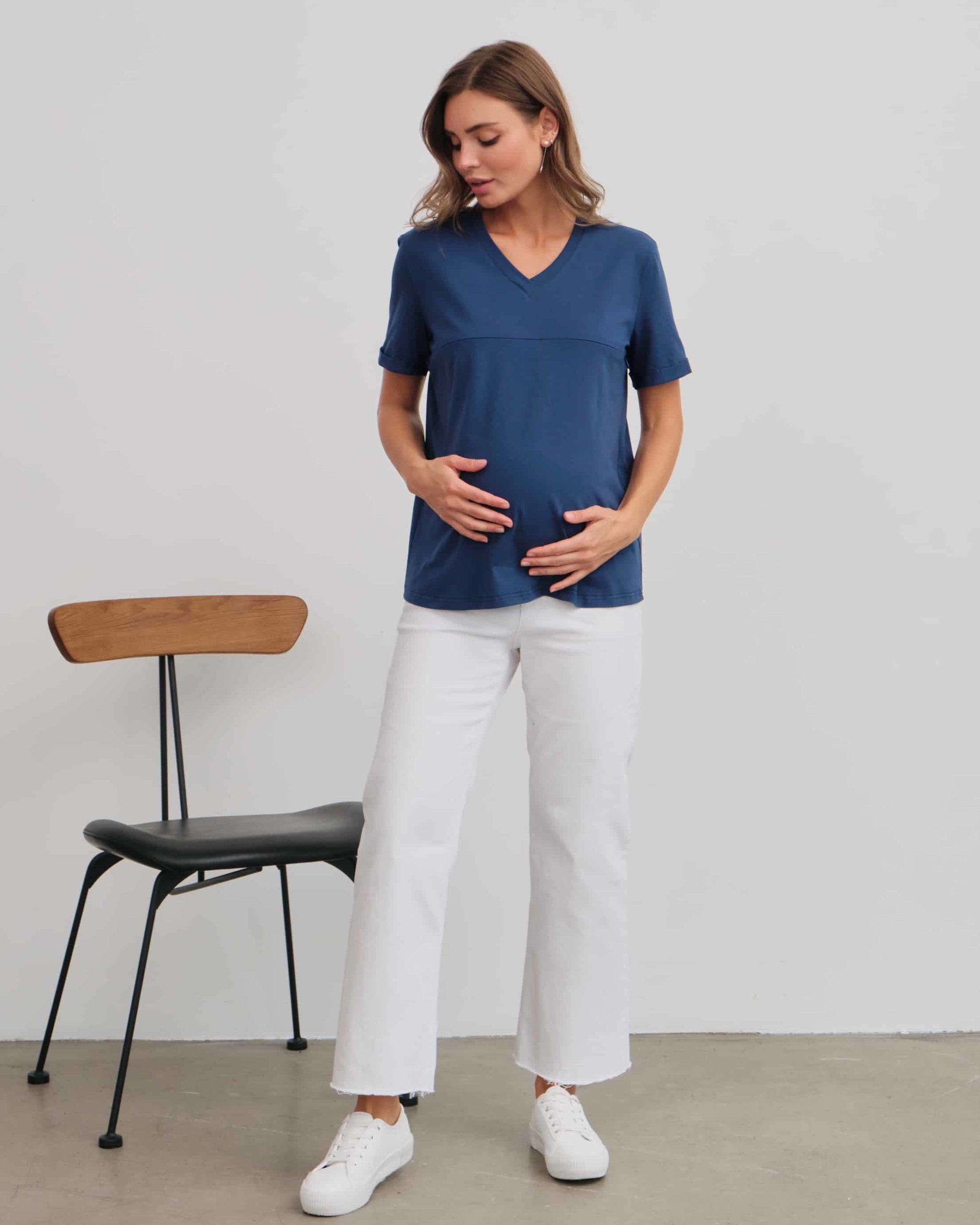 Футболка актуального кроя оверсайз из хлопкового трикотажа с v-образным вырезом. Подойдет для любого срока беременности и после. Секрет кормления: горизонтальная потайная молния.