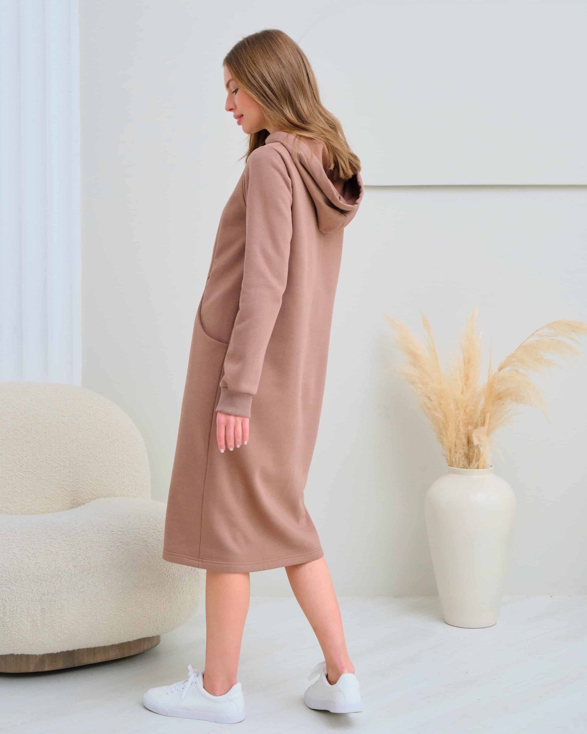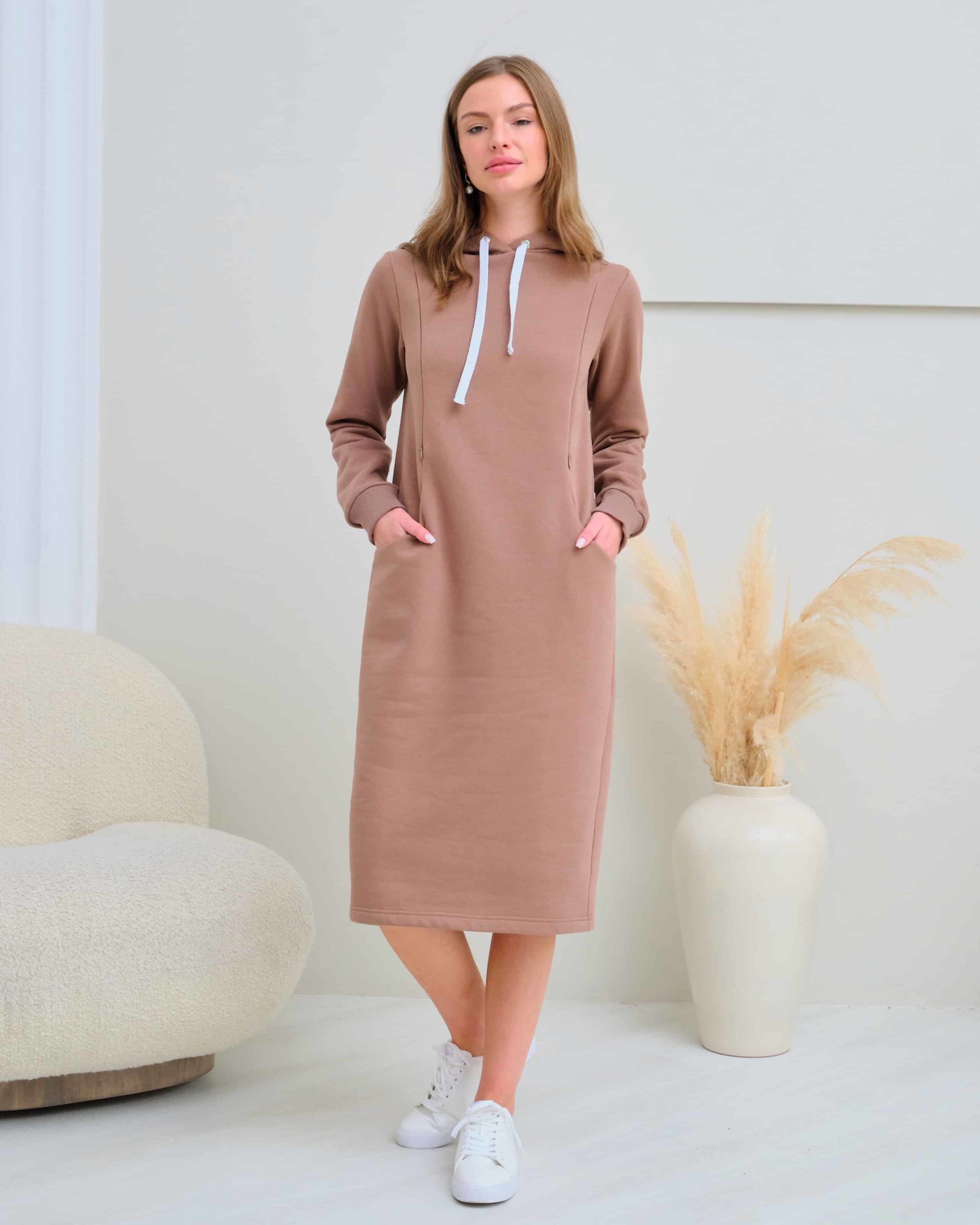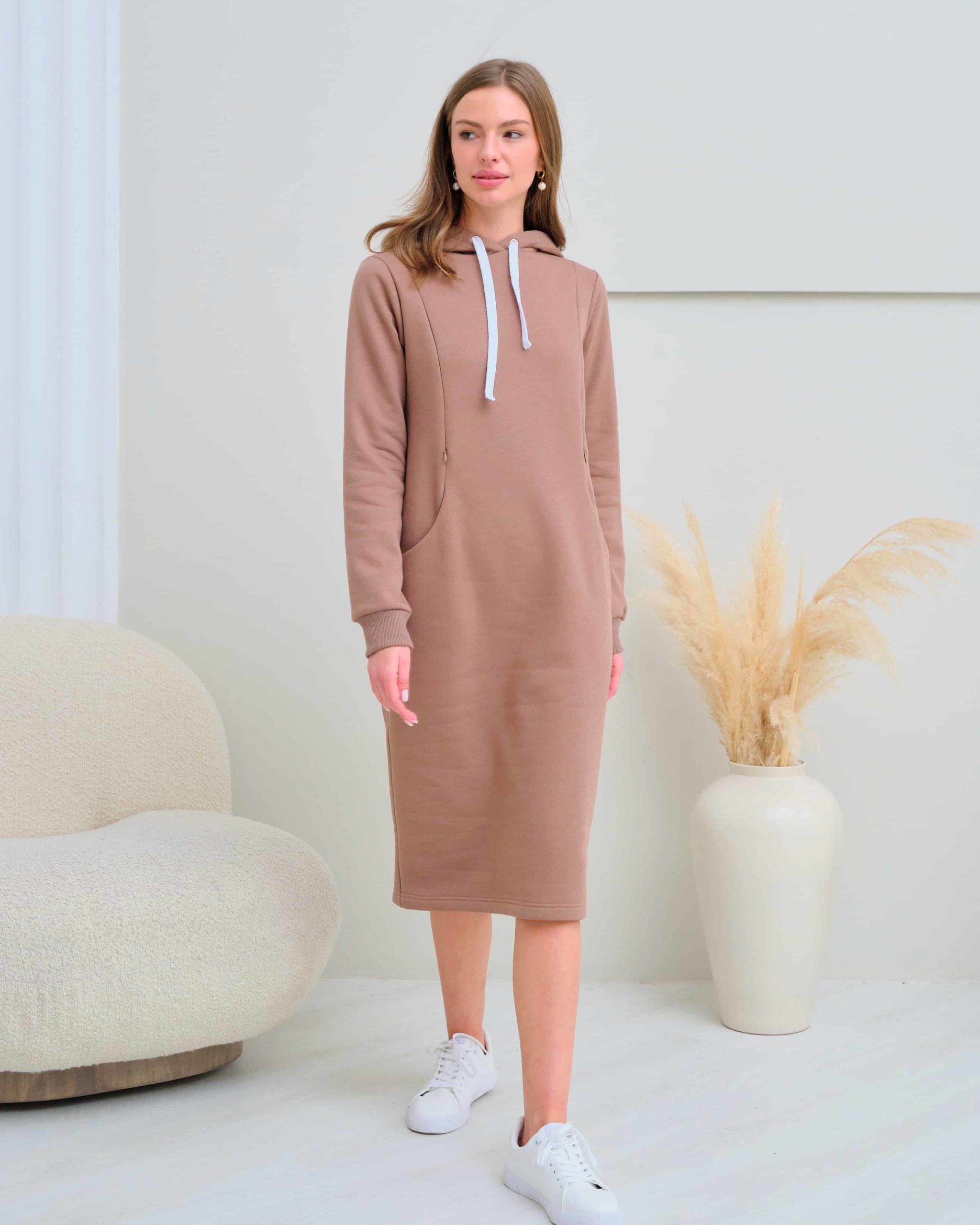 Теплое платье-худи для будущих и кормящих мам из футера высшего качества «пенье» с начесом. Платье выполнено в комфортной длине миди и скроено специально для растущего животика. Для грудного кормления — секреты в рельефах на груди в виде потайных молний. Так же есть удобные боковые карманы и капюшон с регулируемыми завязками.