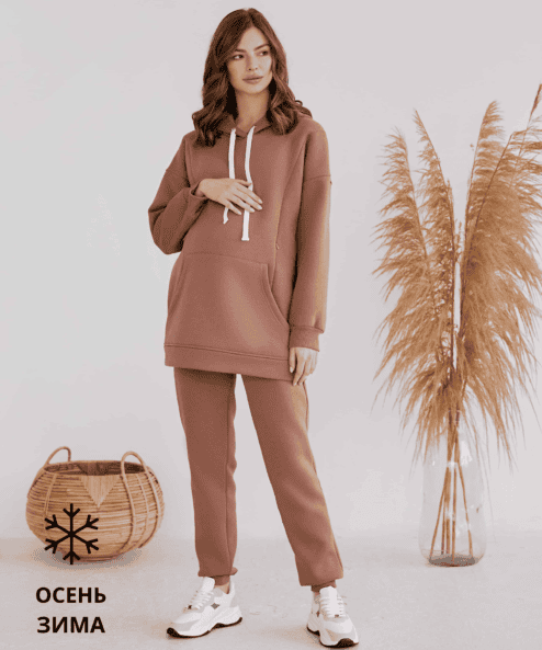 Брючки для будущих и кормящих мам из футера высшего качества «пенье» с начесом. Пояс брюк мягкий и эластичный, что позволяет носить их на любом сроке беременности и после. Бандажный пояс и отделка штанин выполнены из рибаны. В комплекте с брючками вы можете приобрести худи Sport