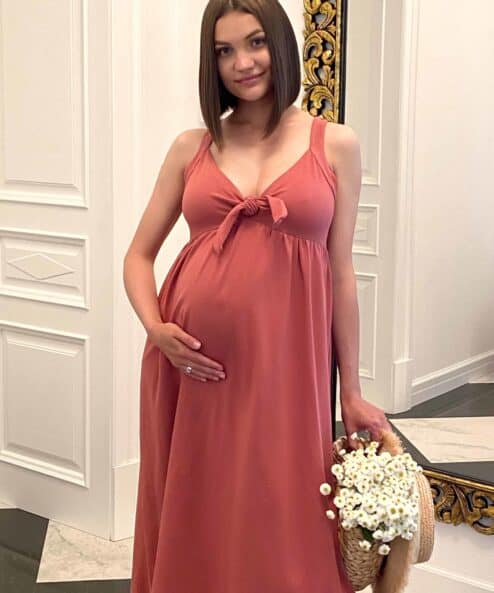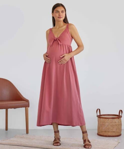 Хлопковый сарафан длины макси, который подойдет на весь период беременности и после. Чтобы покормить малыша, достаточно опустить бретель.