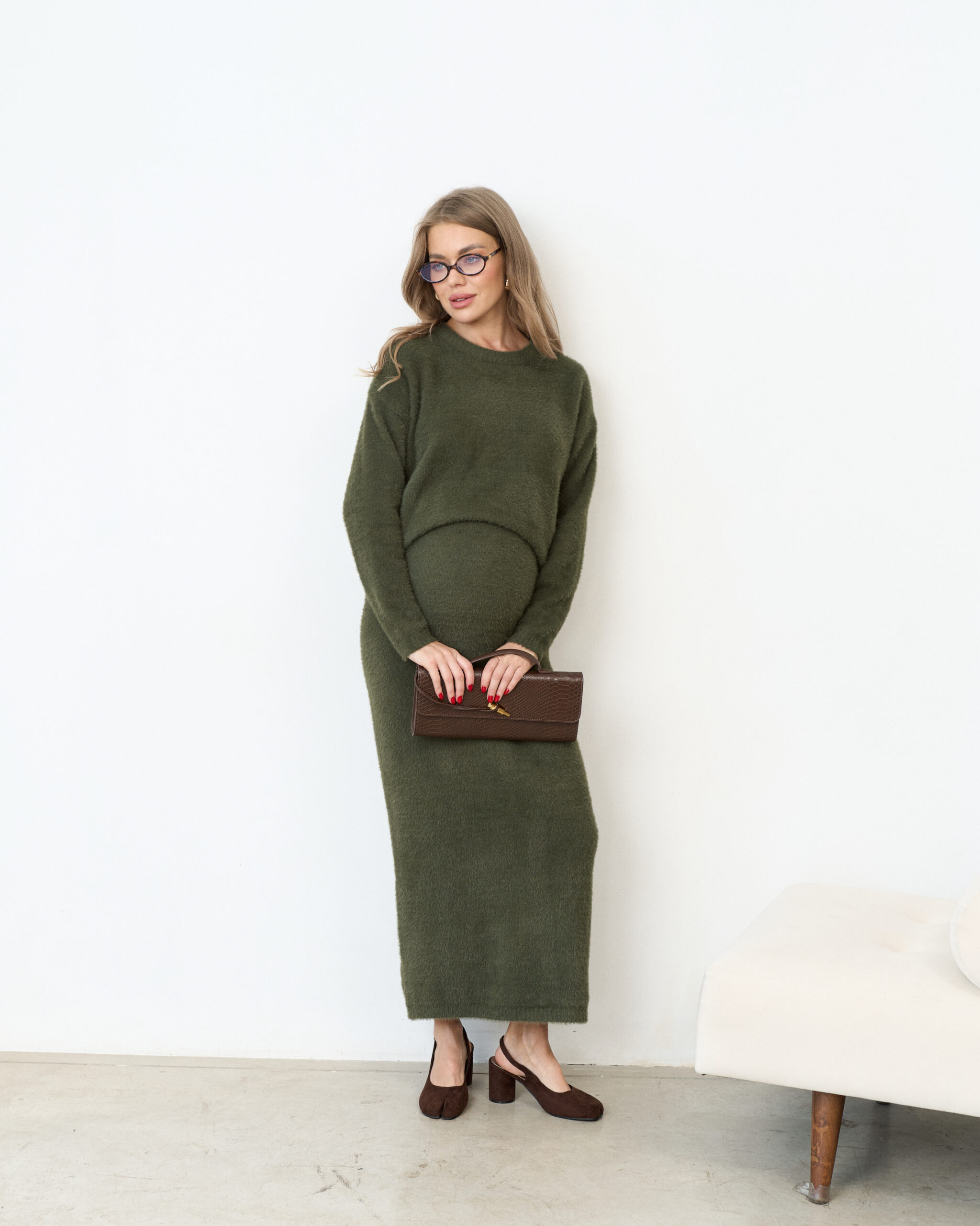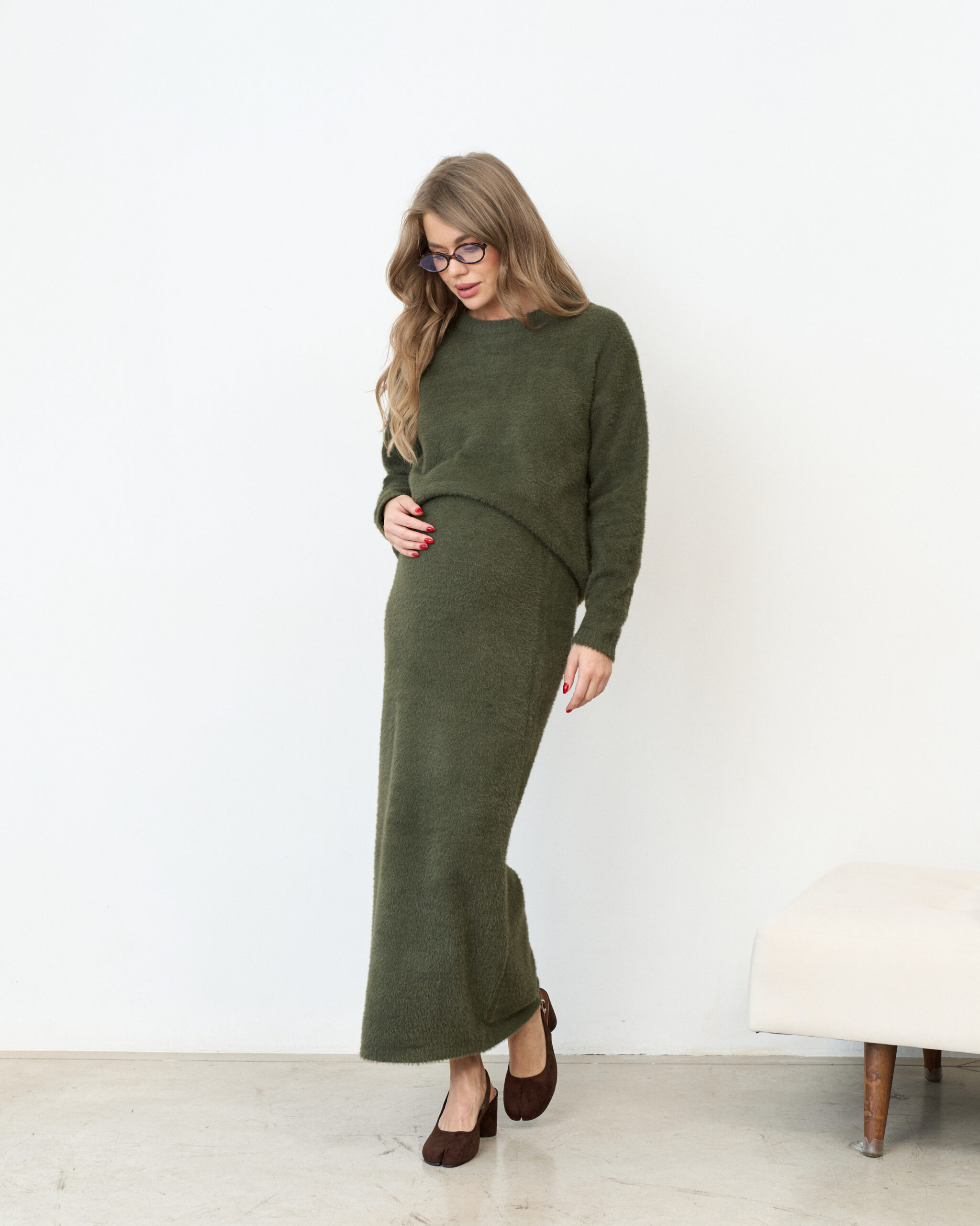 Стильный трикотажный комплект из пушистой пряжи, состоящий из макси-юбки прямого кроя и базового джемпера. Модный фасон стройнит и визуально вытягивает фигуру. Подойдет на период беременности и после.
