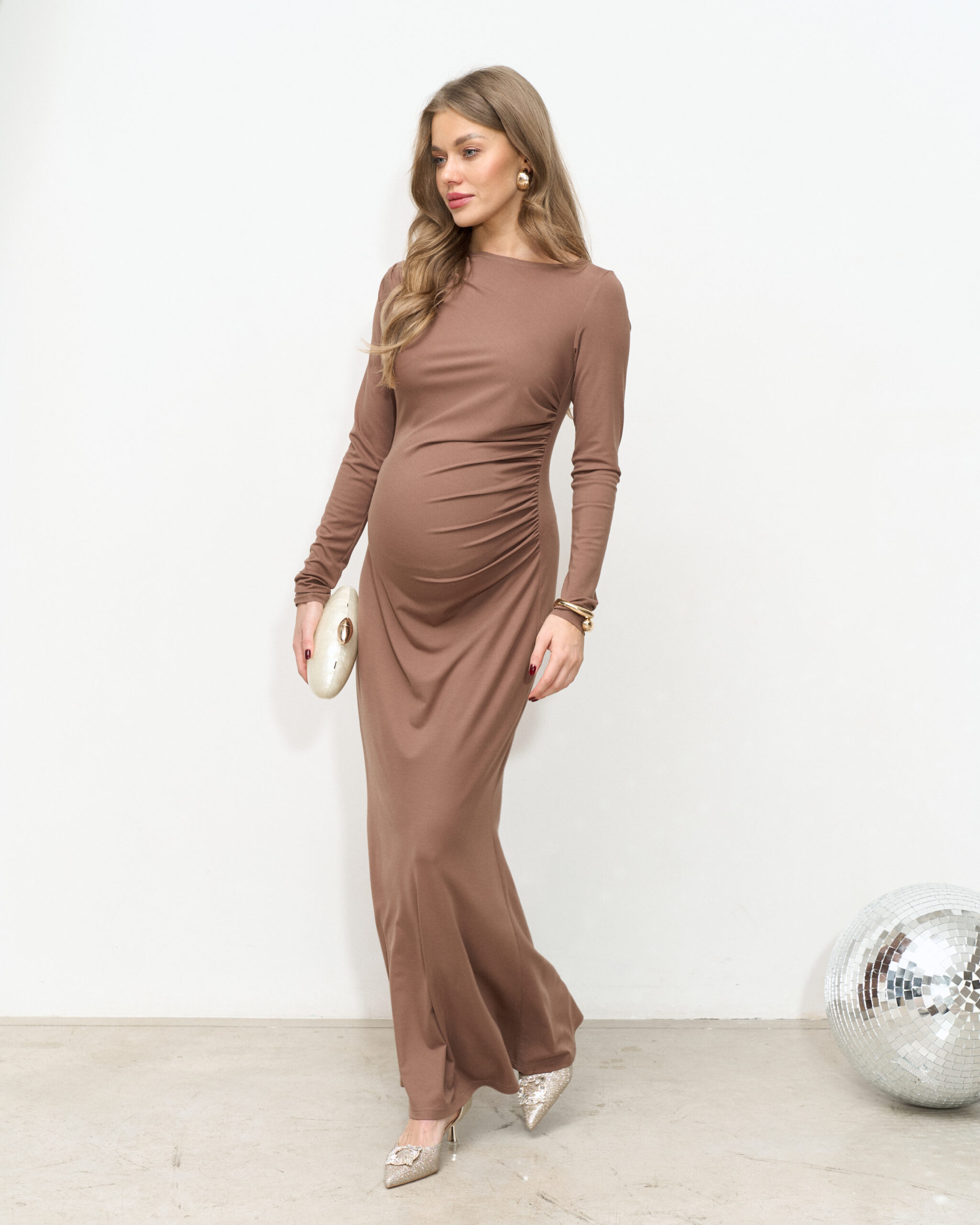 Трикотажное платье в цвете молочный шоколад – модель облегающего кроя.