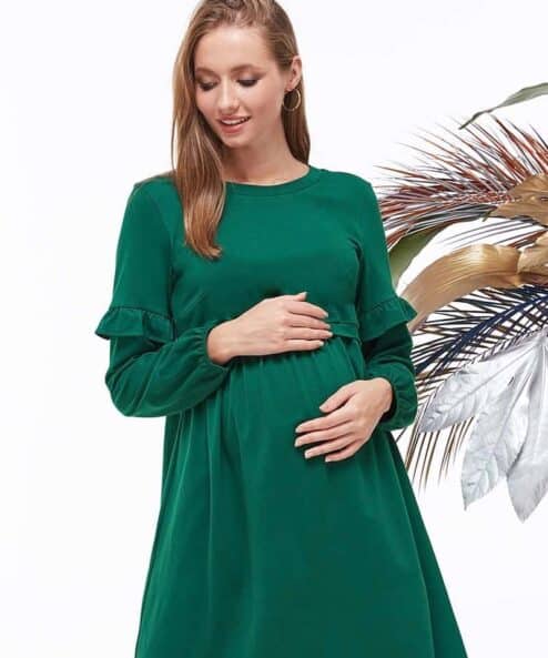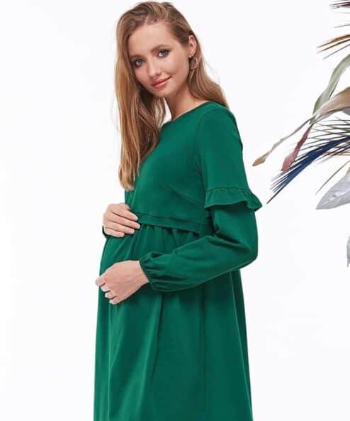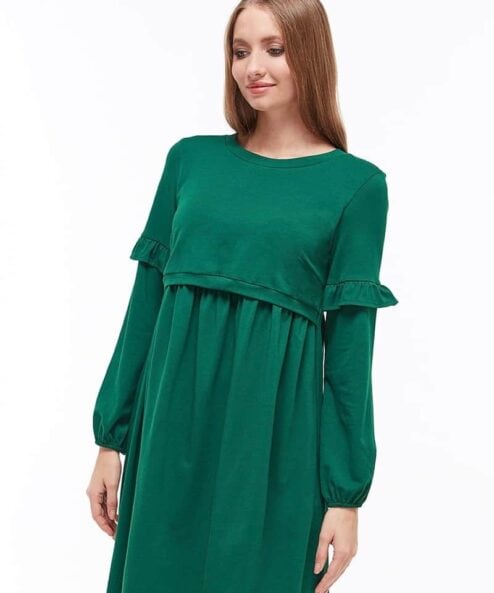 Оригинальное платье с оборками для беременных и кормящих из хлопкового трикотажа. Оборки на рукавах создают интересный и необычный образ. Секрет кормления: верхняя деталь полочки заходит на нижнюю деталь.