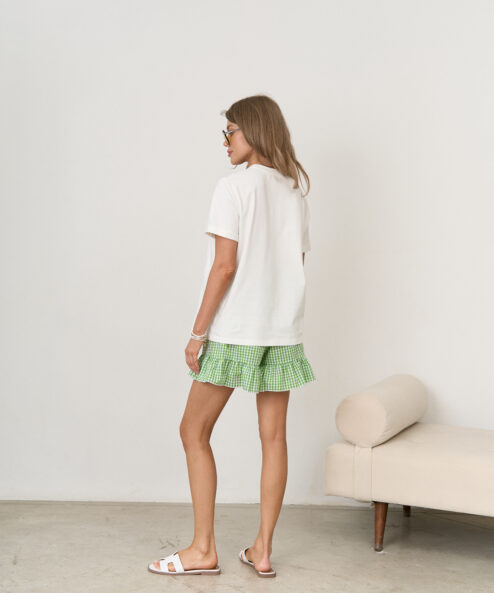 Лёгкие и очень удобные шорты прямого крояс рюшами. Модель изготовлена из приятного к телу хлопкового материала. Высокий пояс на животик регулируется перфорированной резинкой и пуговицей. В комплект к шортам вы можете приобрести рубашку Siesta.