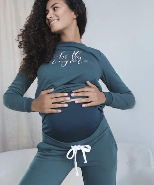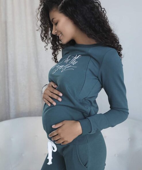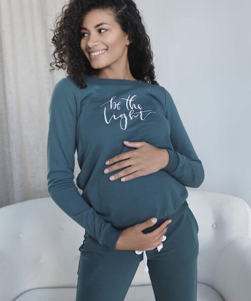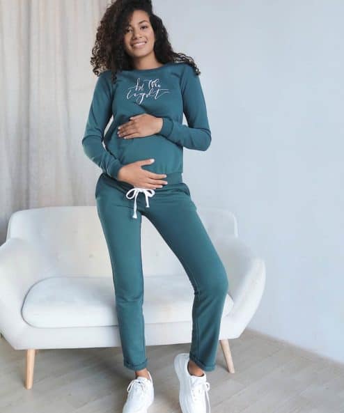 Этот современный костюм из плотного хлопкового трикотажа подойдет на весь период беременности и после. На брюках — высокий пояс, чтобы утеплить растущий животик будущей мамы, и шнурок для регулировки объема. На свитшоте — принт «Be the light» и незаметные молнии для кормления малыша.