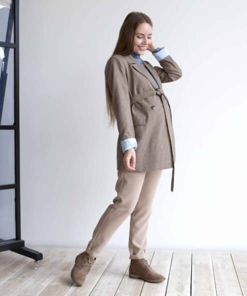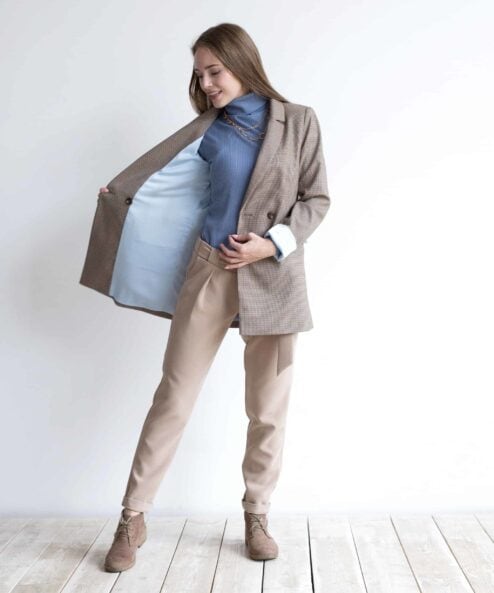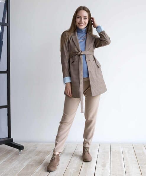 Классический двубортный жакет с подкладом из искусственного шелка. Отлично подойдет в комплект к брюкам джинсам, юбкам и платьям. Можно носить круглый год, с поясом и без, создавая различные образы